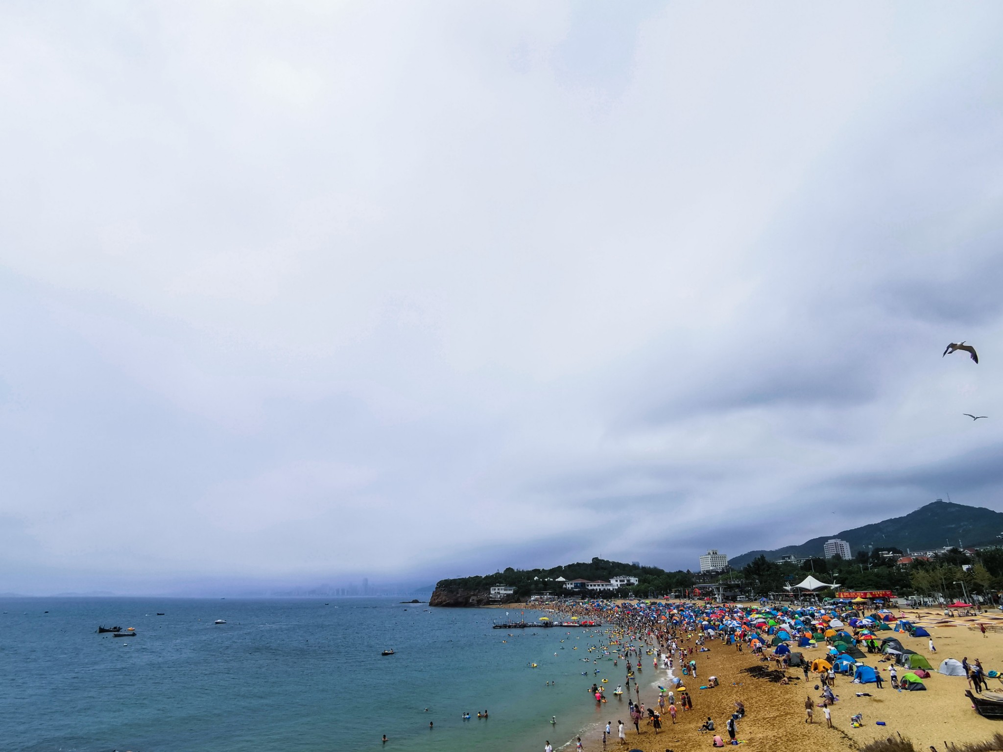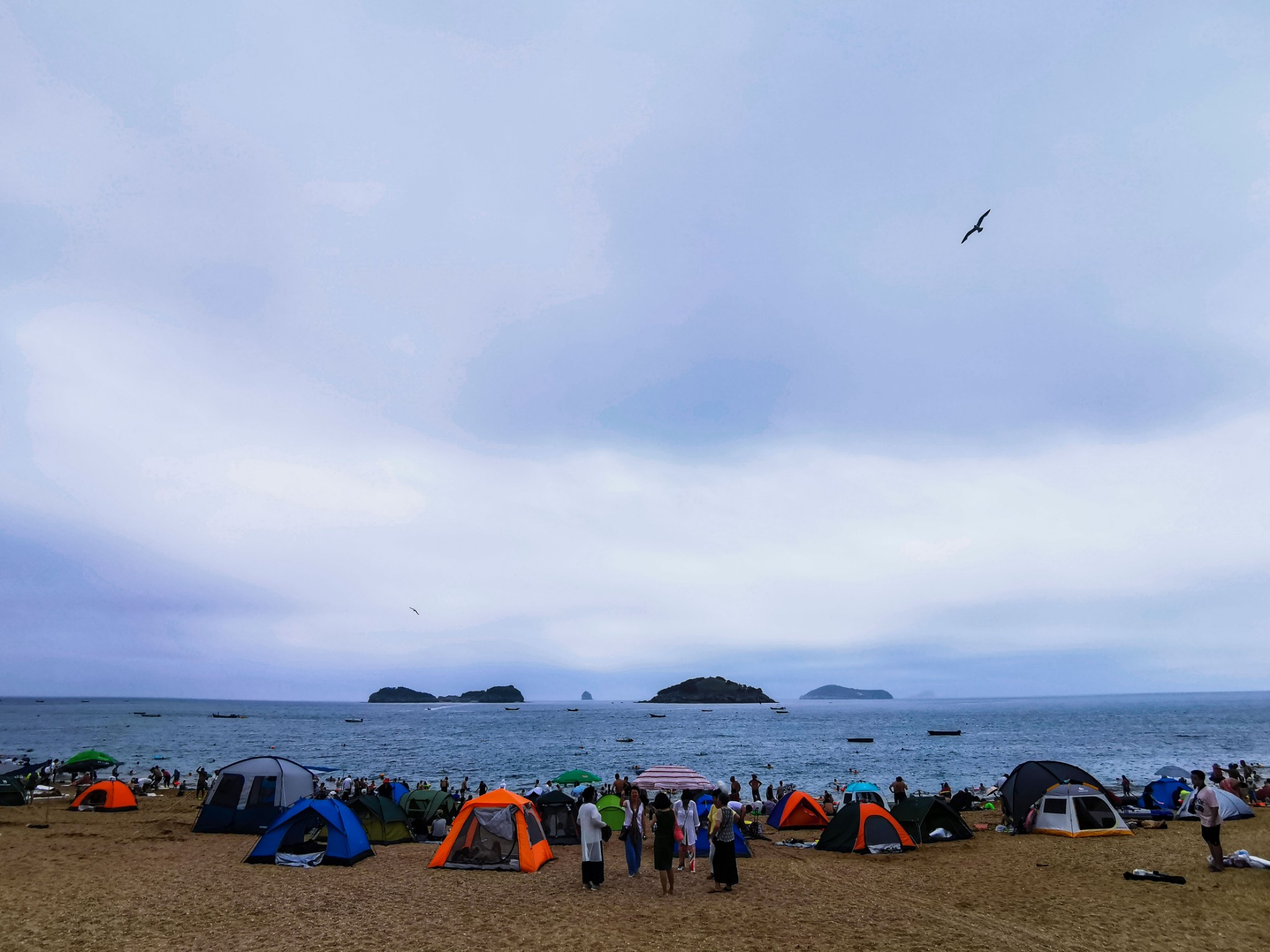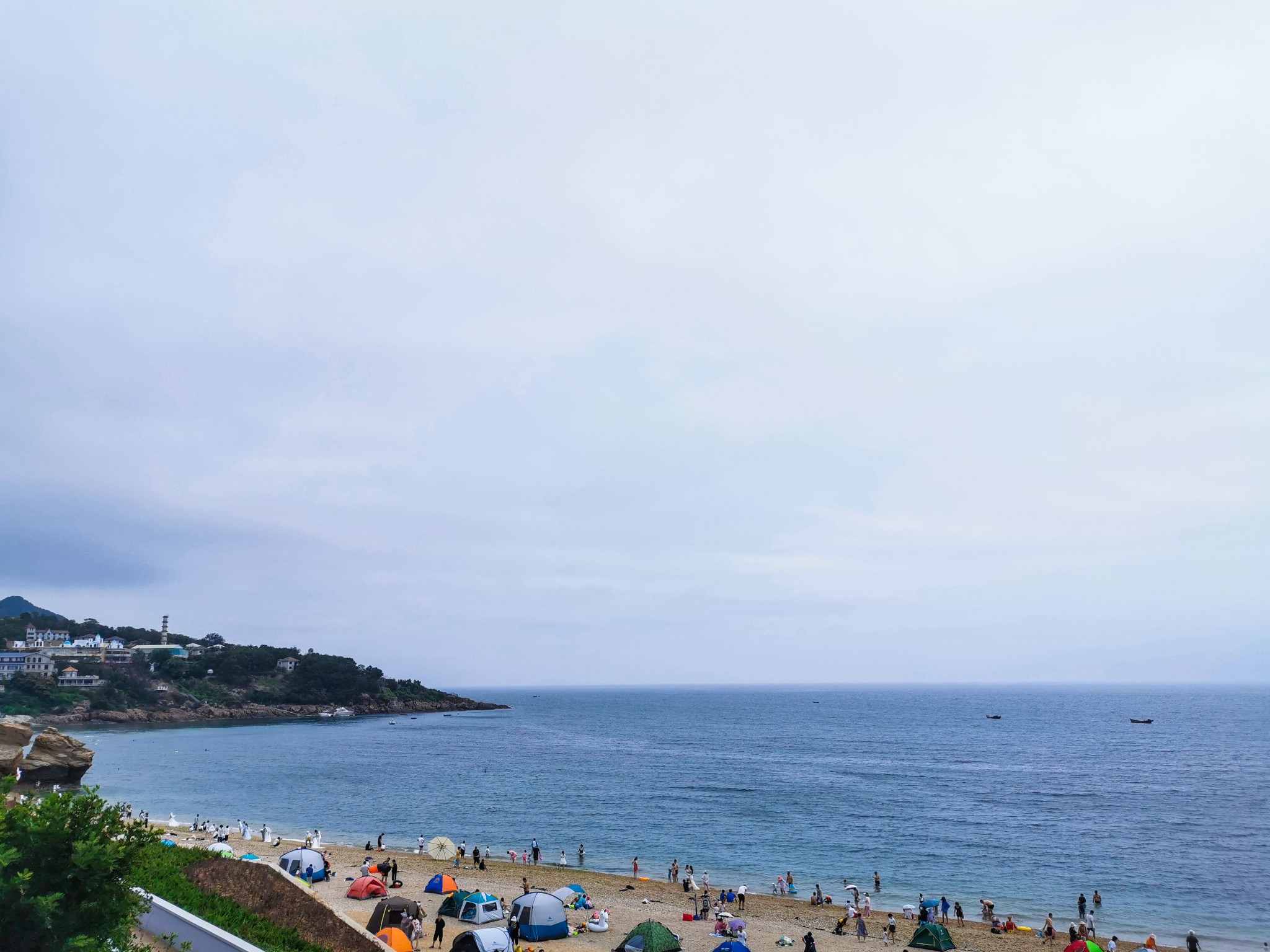 傅家庄浴场不收门票,应该是人最多的地方,赶上周末,当地人多拖家带口一家人在沙滩上搭一个帐篷,备着些吃食,下海玩会水,累了就上岸休息。