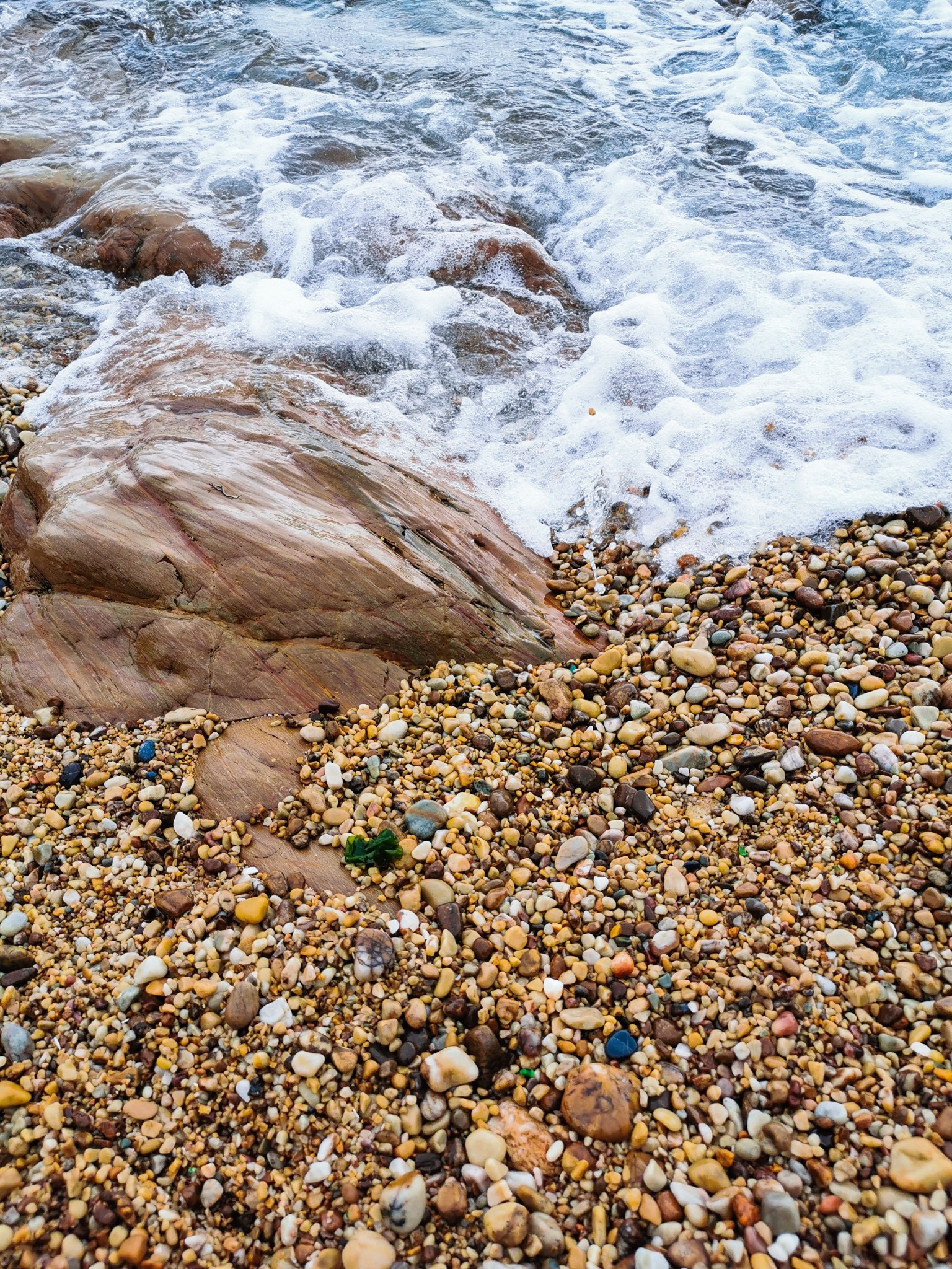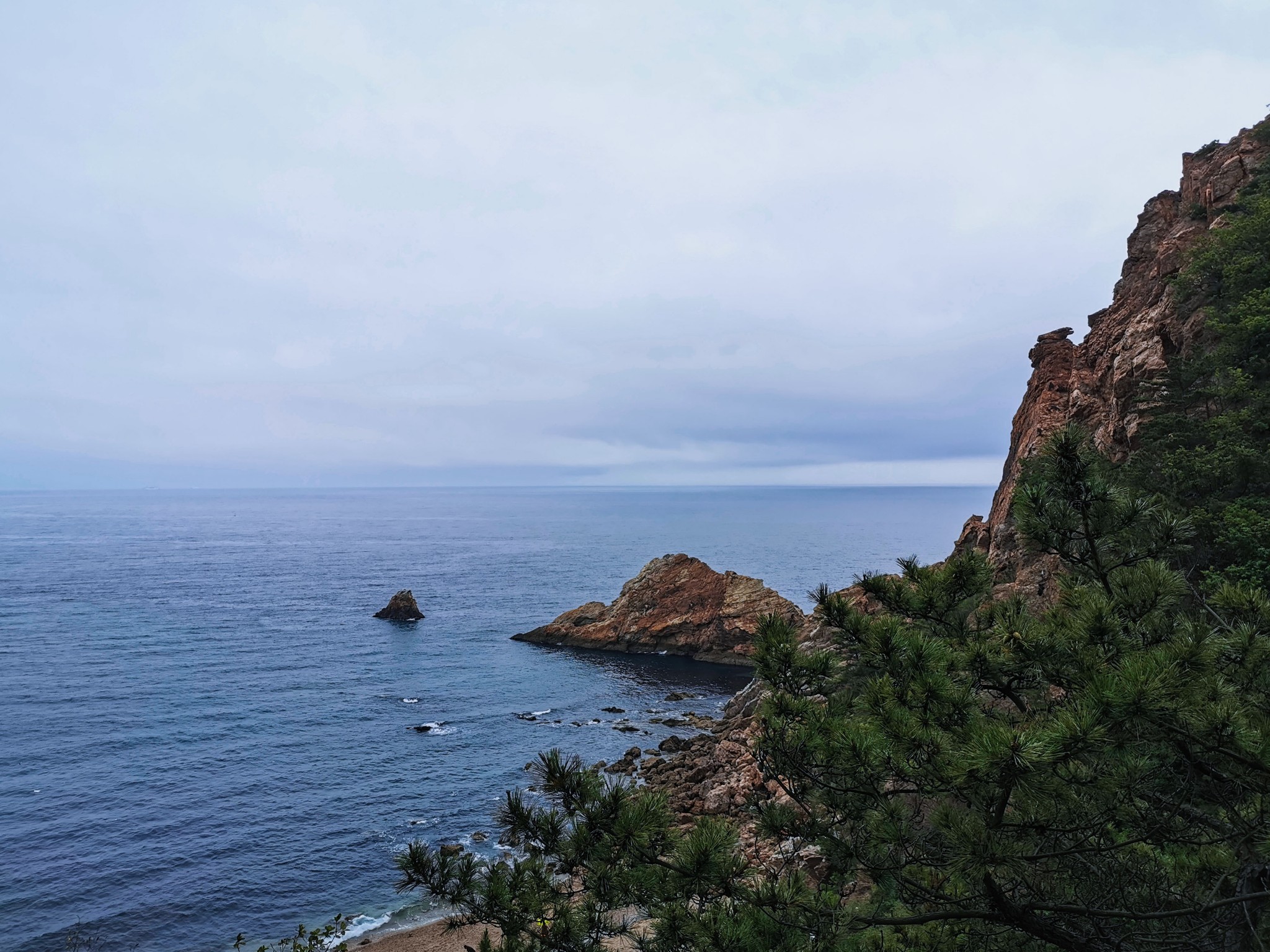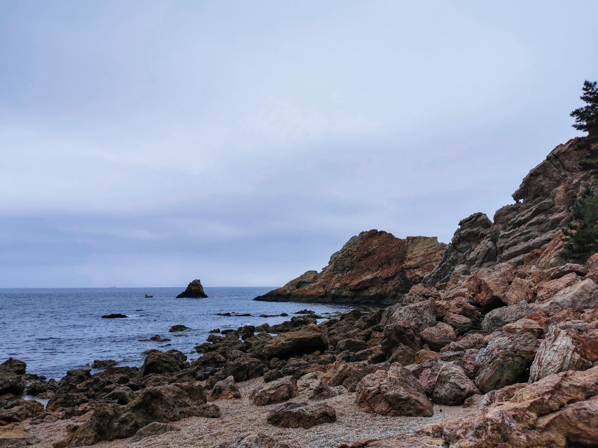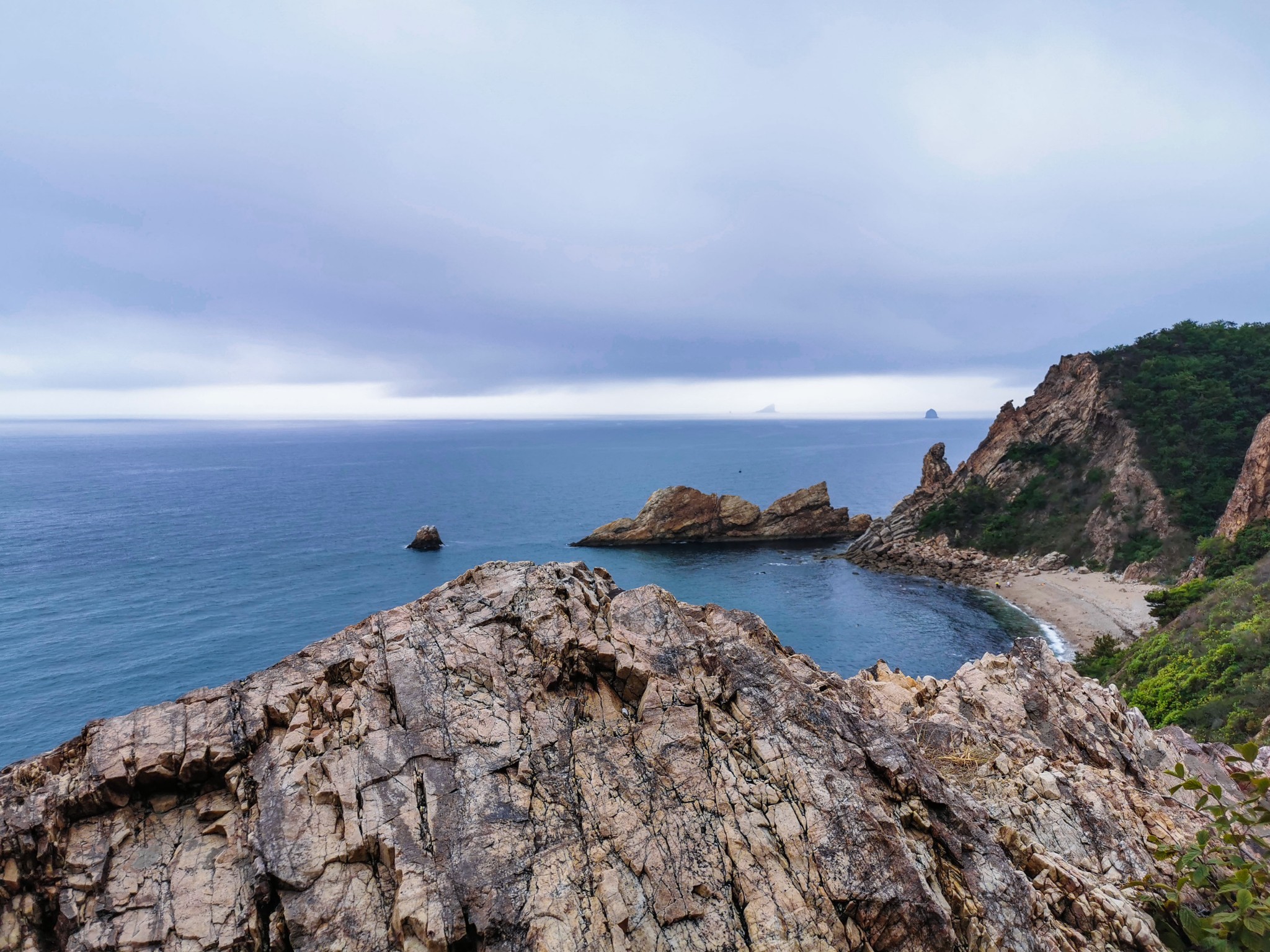 沿着小道走到底,有一片小沙滩,此处只有几个游人,有在沙滩上捡石子的,有在礁石上找贝壳的。索性加入他们的行列,坐在沙滩上挑起石头来了。