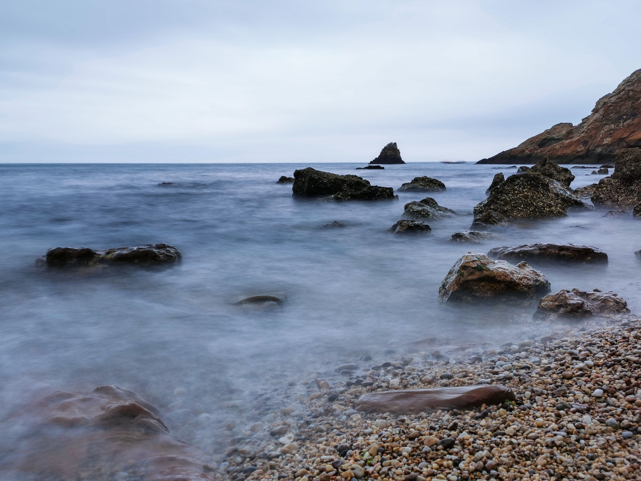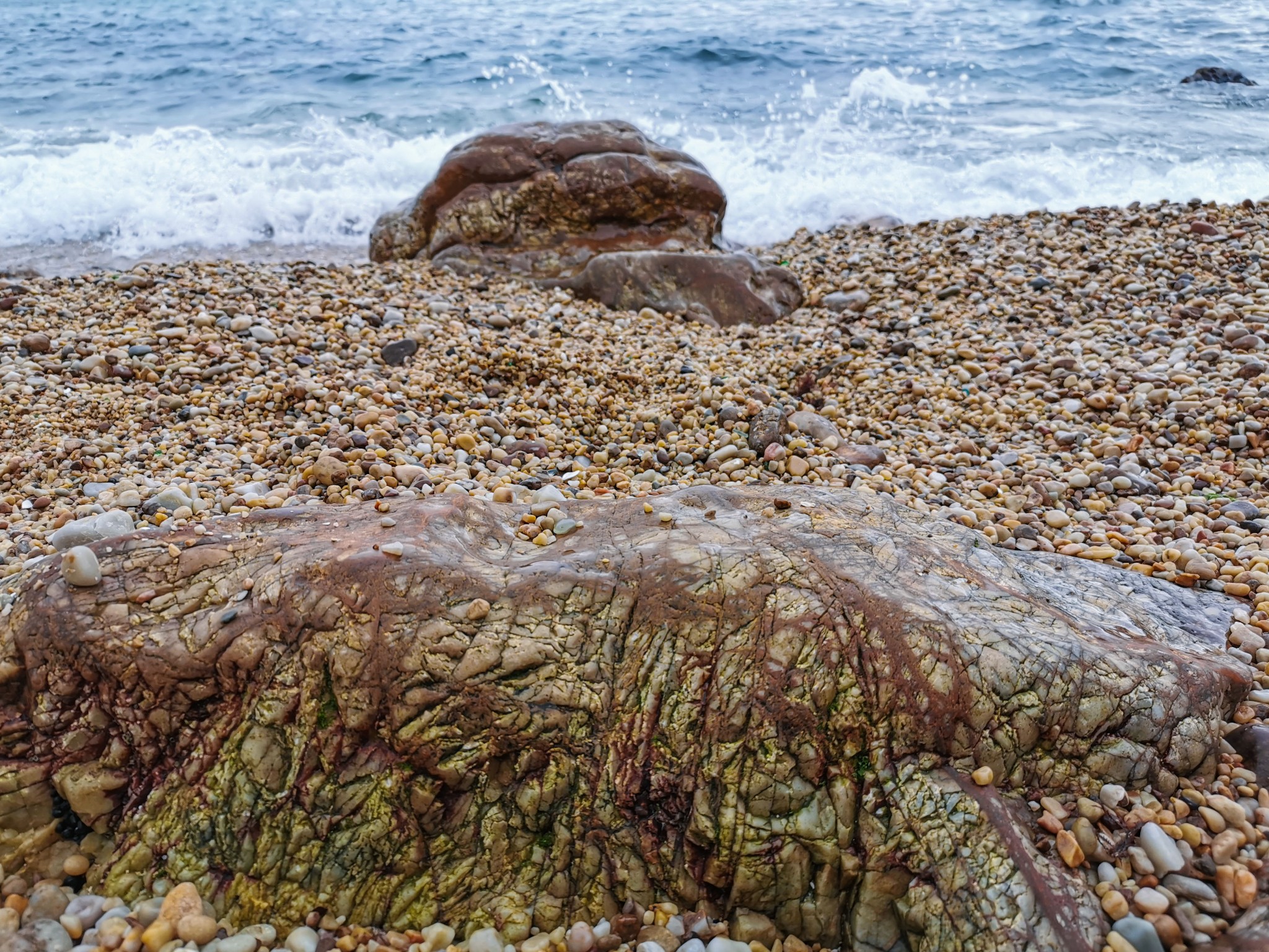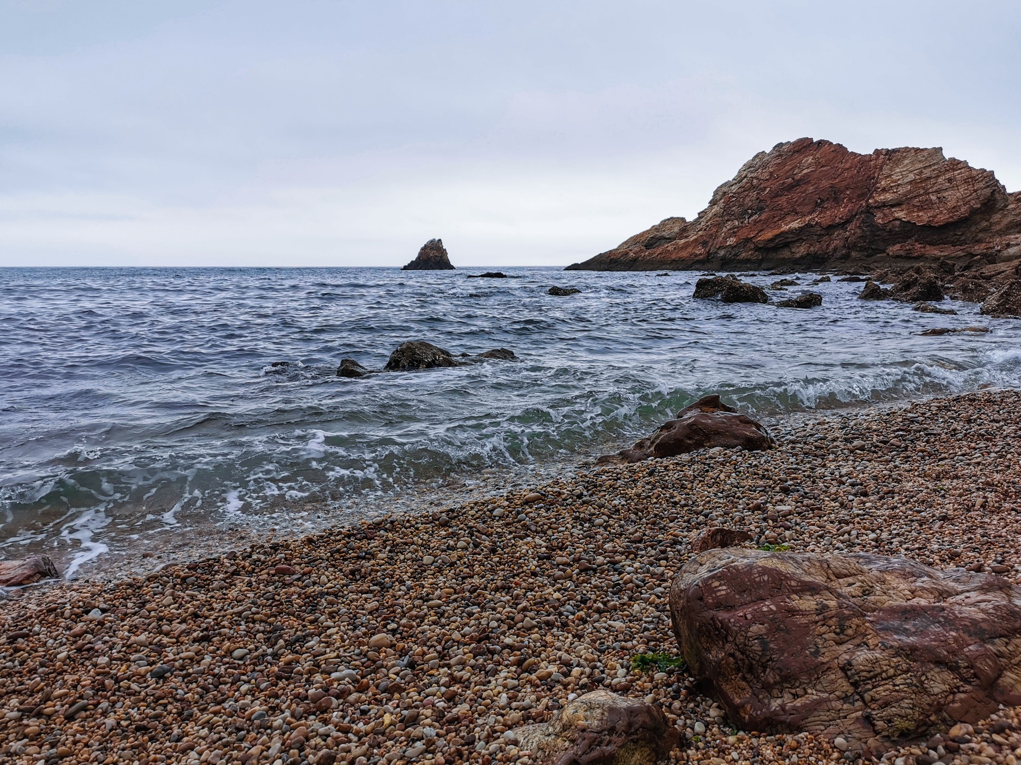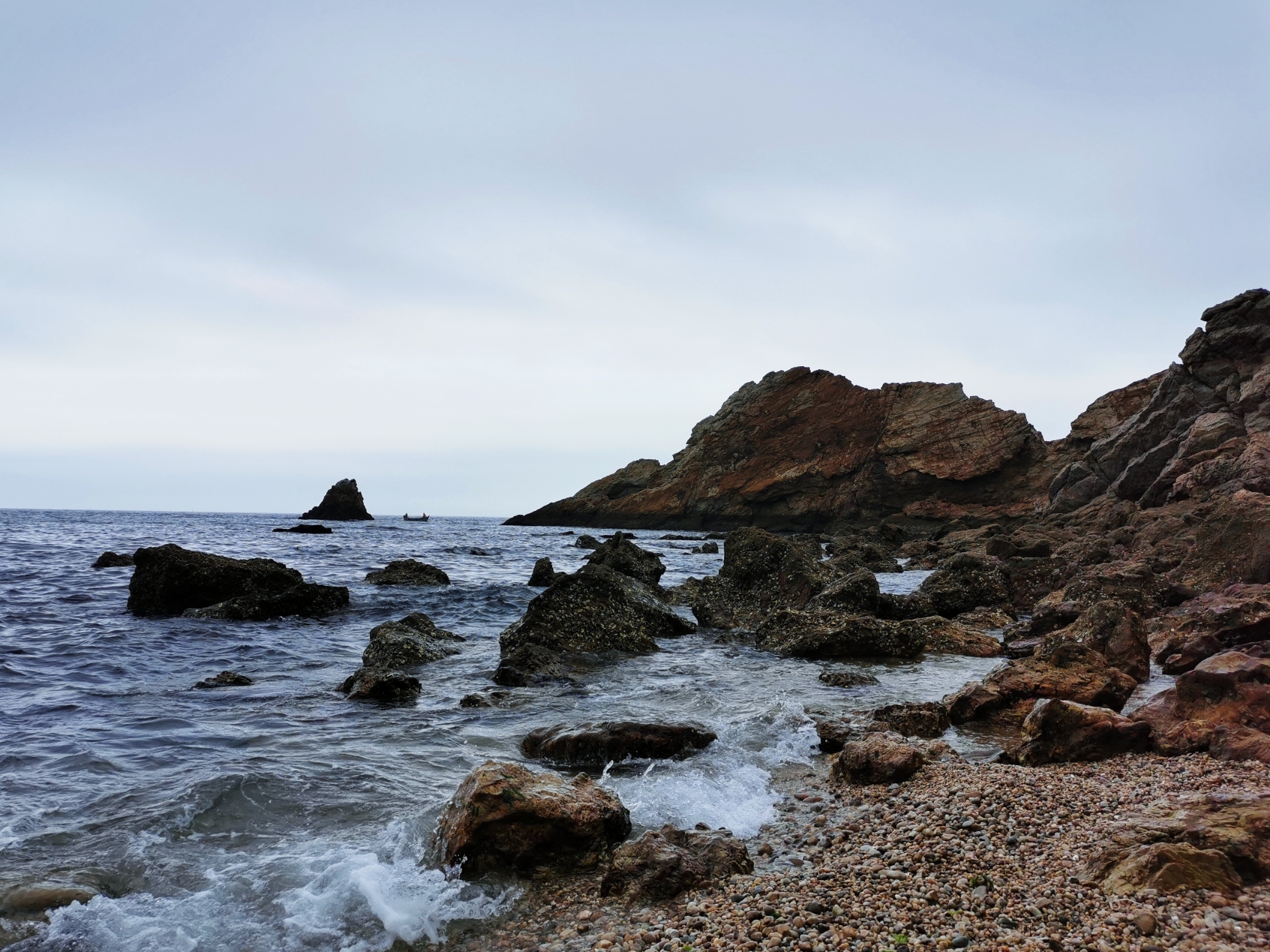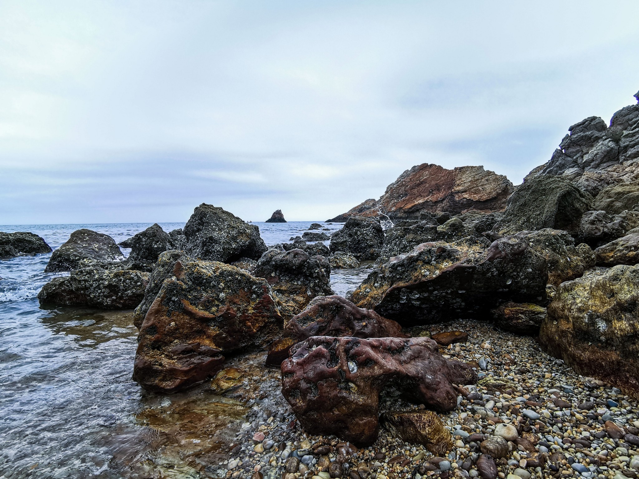 沿着小道走到底,有一片小沙滩,此处只有几个游人,有在沙滩上捡石子的,有在礁石上找贝壳的。索性加入他们的行列,坐在沙滩上挑起石头来了。