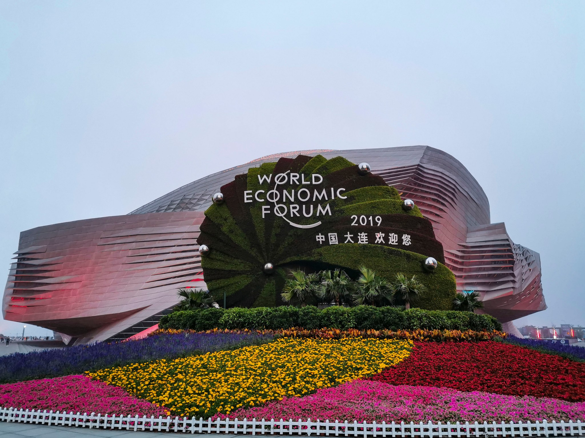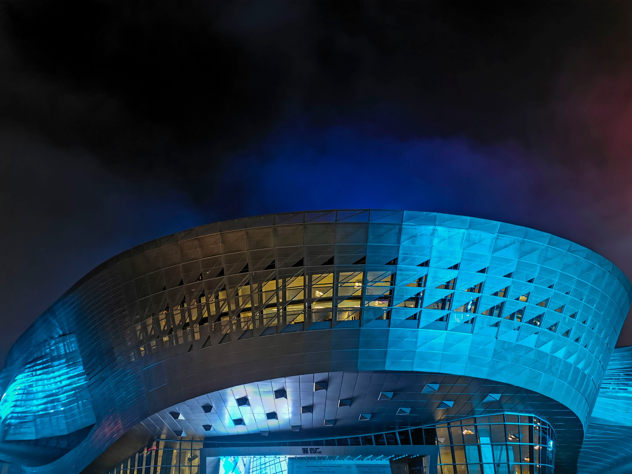 大连 国际会议中心坐落在 大连 东港 商务区、CBD核心区,是夏季 达沃斯 论坛 中国 区主会场, 中国十大剧院之一。建筑内外墙及屋面采用了双层幕墙结构,室外面层为穿孔金属板幕墙,室内面层为玻璃幕或金属板。该建筑形象地反映 大连 背山面海的地理位置及对 大连 天然港湾的暗示。“山海”主题贯穿了整个建筑设计,室内设计以“海”文化为中心,进行室内空间的塑造 和美 化,采用国际化的设计手法,融合传统的 中国 文化,创造了一个完美的艺术文化空间。
