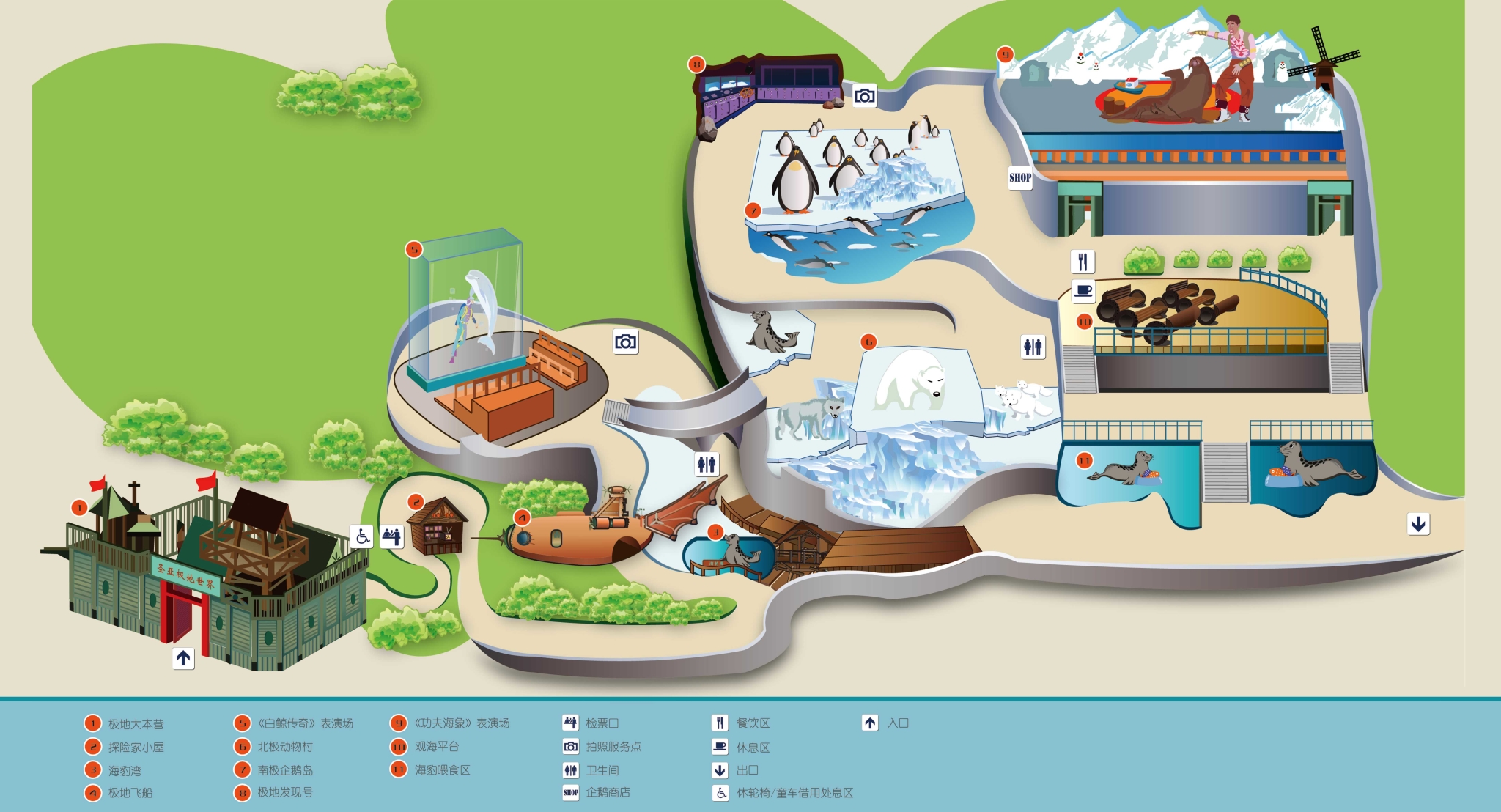 极地世界以展示南 北极 动物为主,常年有白鲸、海象、海狮表演。于2003年4月建成并对外开放,同样采用情景式主题乐园的风格,向游客全面展现极地世界的风貌。