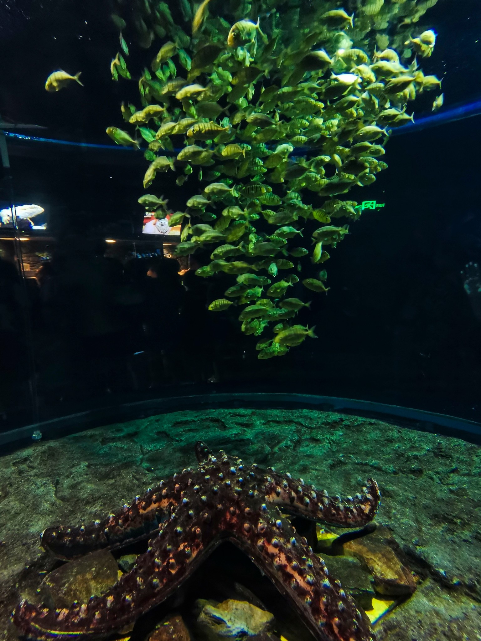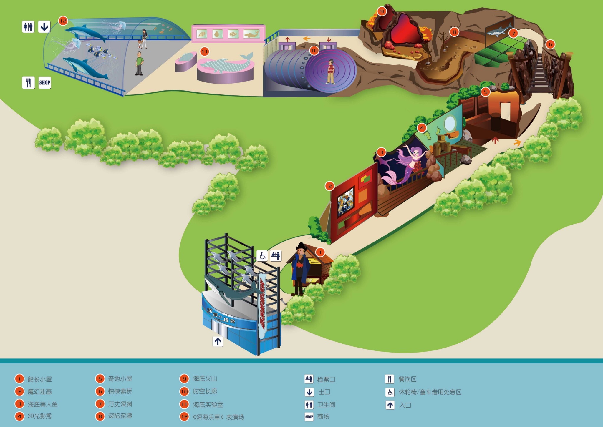 深海传奇馆比较小,唯一的看点就是拱形天幕影院了。《深海乐章》播放于超IMAX拱形天幕影院:长40米、宽10米、高5米的巨大拱形画面,高达IMAX四倍的影片解析度,32架动态全息音响,180拱形天幕将你笼罩其中…让你全身心浸入震撼深海。巨大拱形天幕,将人180°笼罩其中!电影《深海乐章》由 美国 动画片《功夫熊猫》的动画导演李洪担任动画指导, 中国 新锐漫画家本杰明担任艺术指导, 上海 电影译制片厂音效大师张拯担纲音乐创作和音效制作……原创三大深海乐章:沙丁鱼圆舞曲、水母小夜曲、鲸群交响乐,全景呈现让人目眩神迷的海底生物奇观。