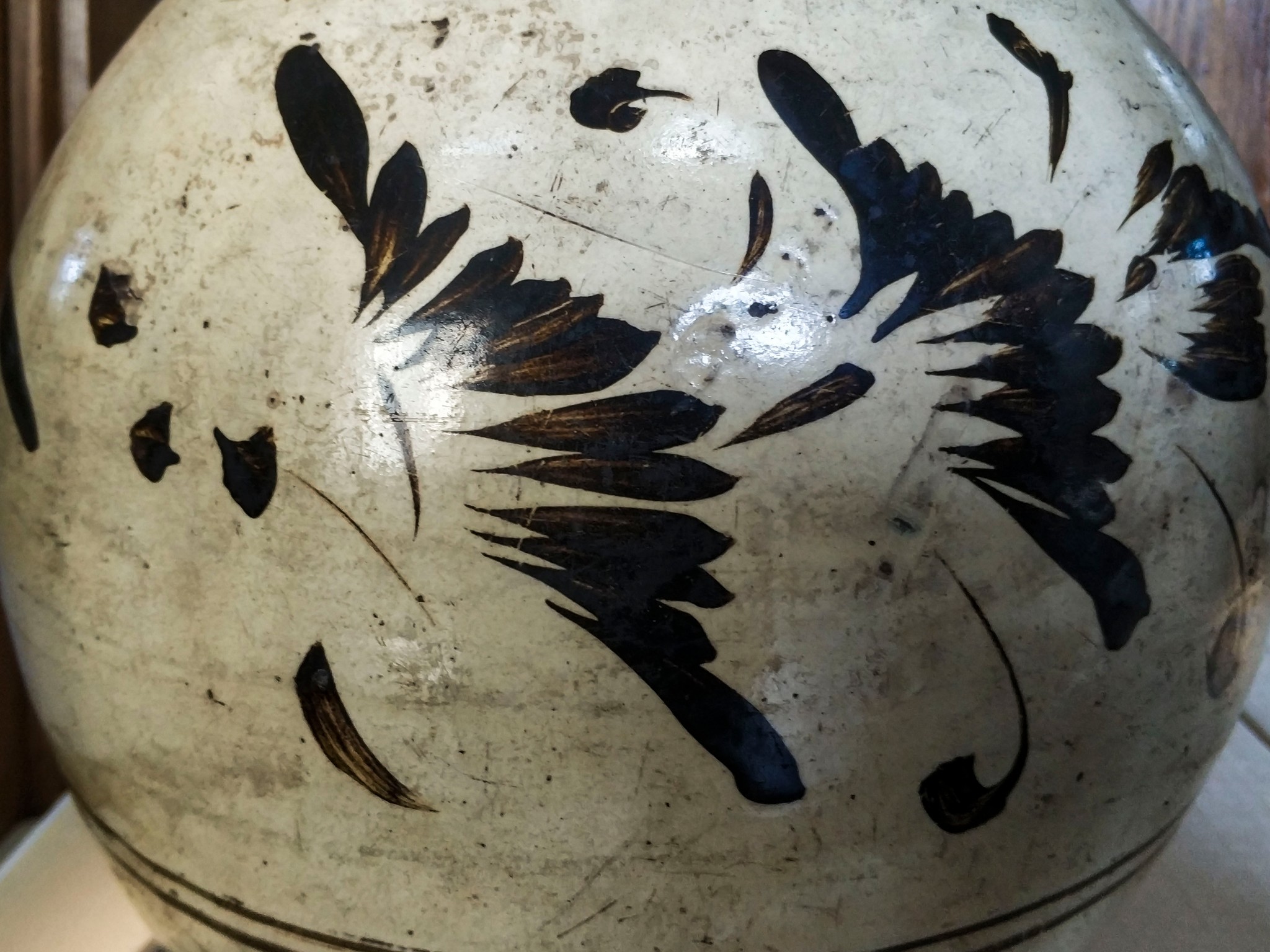 直口,短颈,溜肩,鼓圆腹,平底内凹。通体施白釉,绘褐彩纹饰,肩部为四朵葵花纹,间饰草叶纹。腹部以双线画两个开光,内绘 云龙 图案,蛟龙翻腾,极富神韵,开光间绘菊花。构图丰满,具有粗犷豪放的艺术风格,是典型的磁州窑系产品。