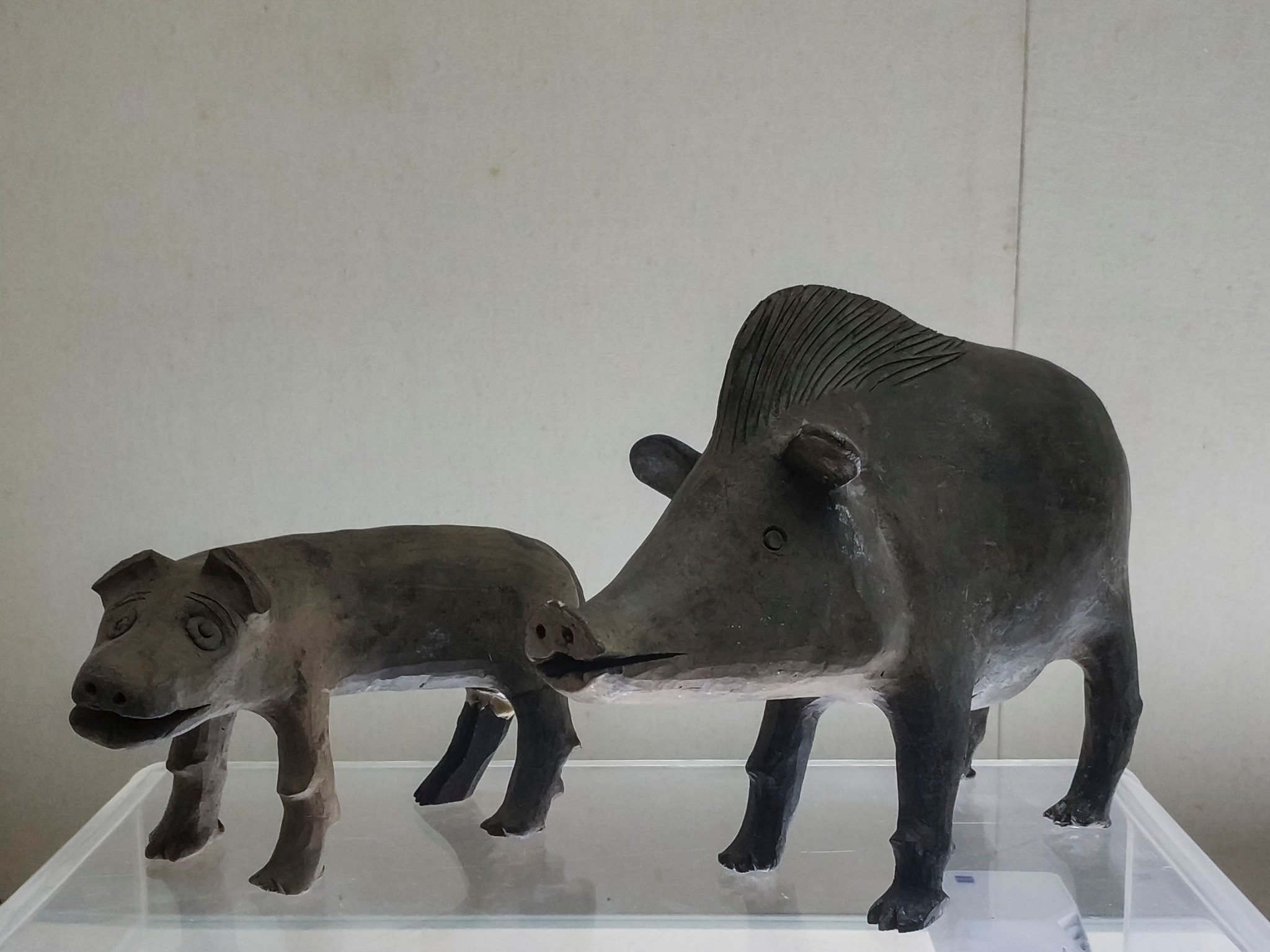 灰陶质,站立状,吻部长而前伸,鼻上翘,阴线刻小圆眼,两耳煽张,脖颈粗,头顶至脊背阴线刻划的鬃毛高隆成扇面形,鬃毛后部弯折体贴,臀后有一短尾。猪健壮肥大,蹄蹶较高,着地有力,有野性特征。