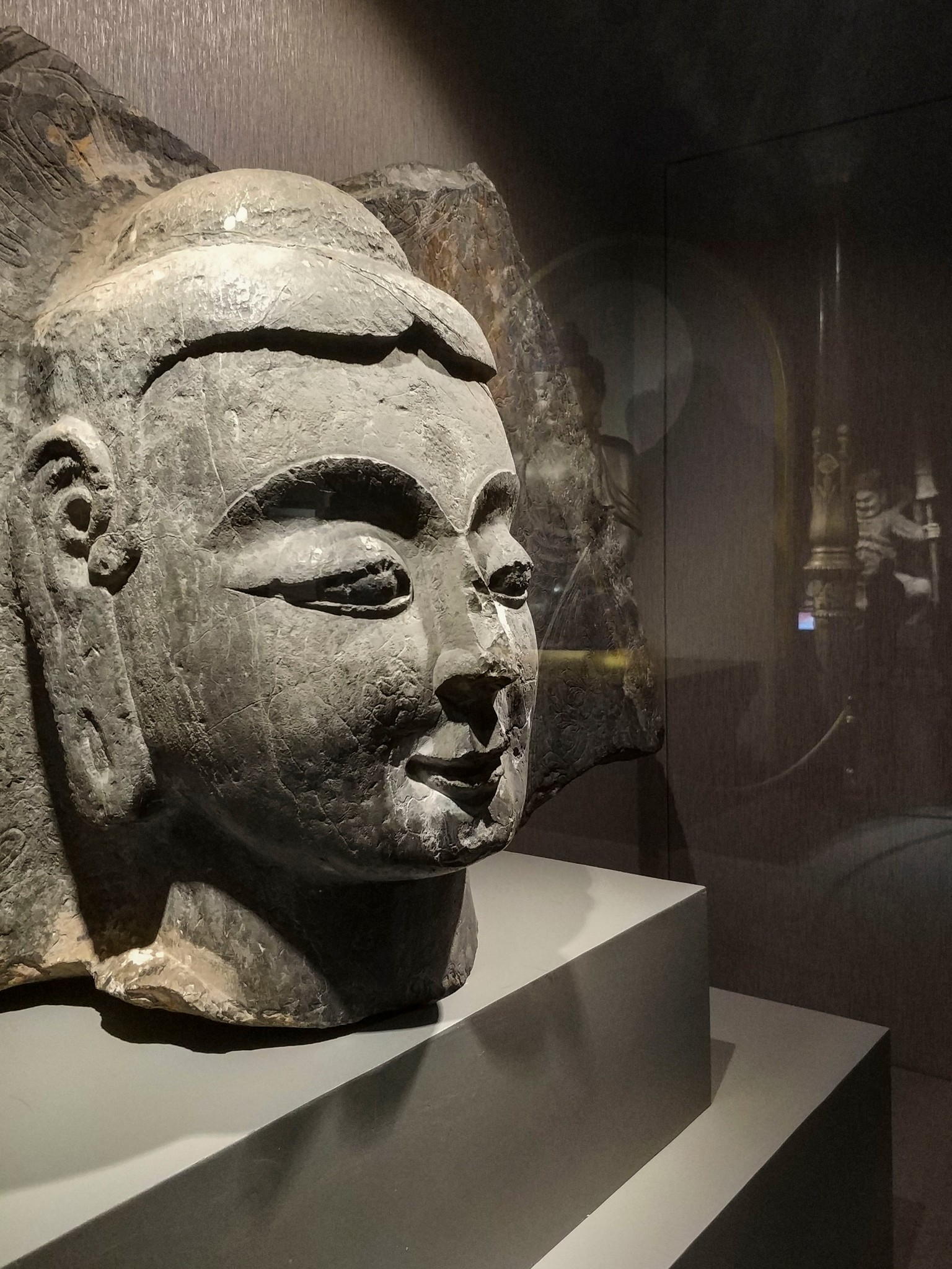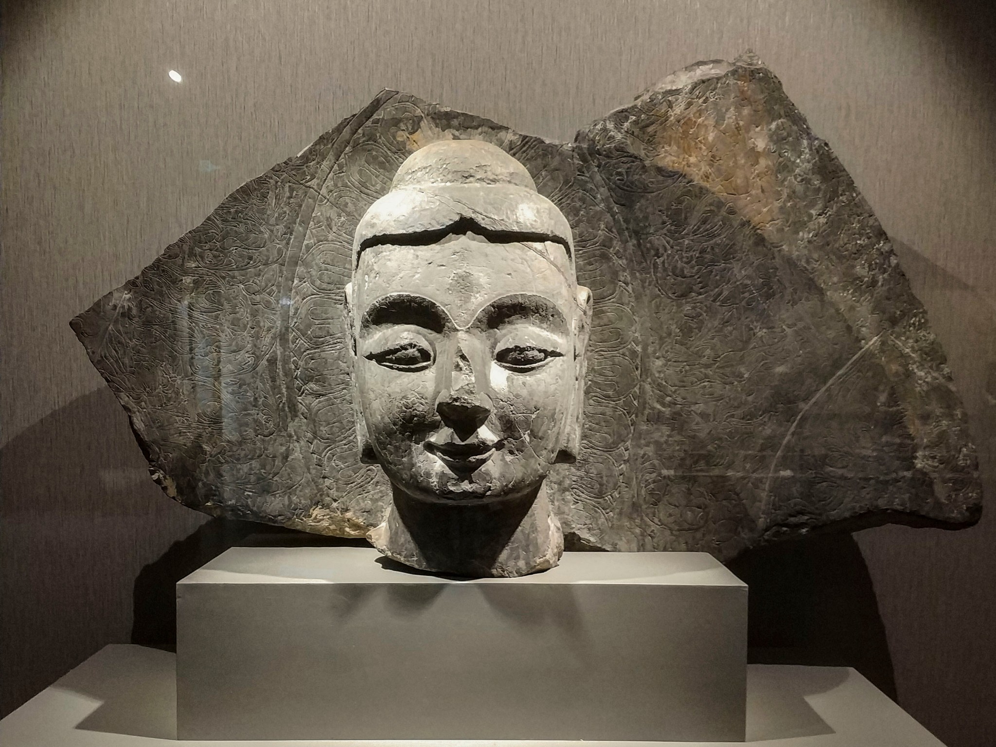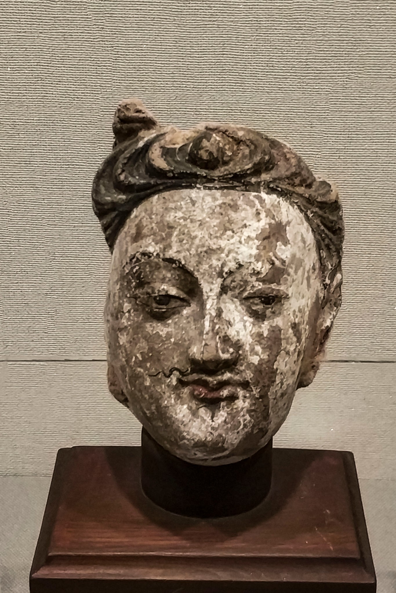 扁圆形高肉髻,波状发纹。面部雕琢精美、刻画细微,表情安详,如入禅定。额头宽平、眉心有白毫,眉际与鼻相连,鼻 梁平 直、凹目,鼻的正面与前额连为一体,鼻翼的两侧向上延伸与额面自然形成眉骨。上眼睑突出于下眼睑,眼睑低垂,呈现半开的寂静相。双唇轮廓分明,嘴角呈现三角形内窝,下颌饱满而凸起。具有早期犍陀罗风格特征。