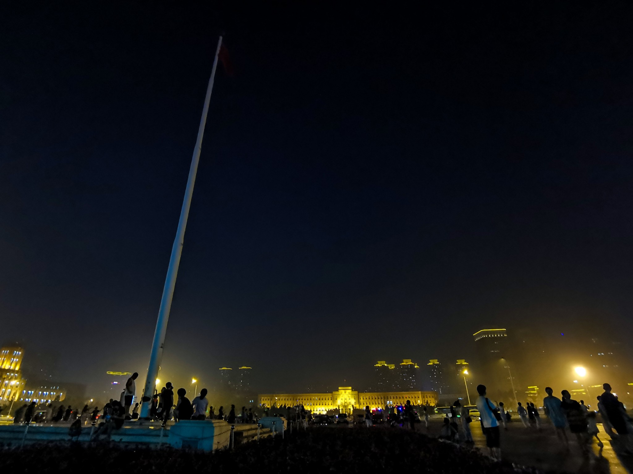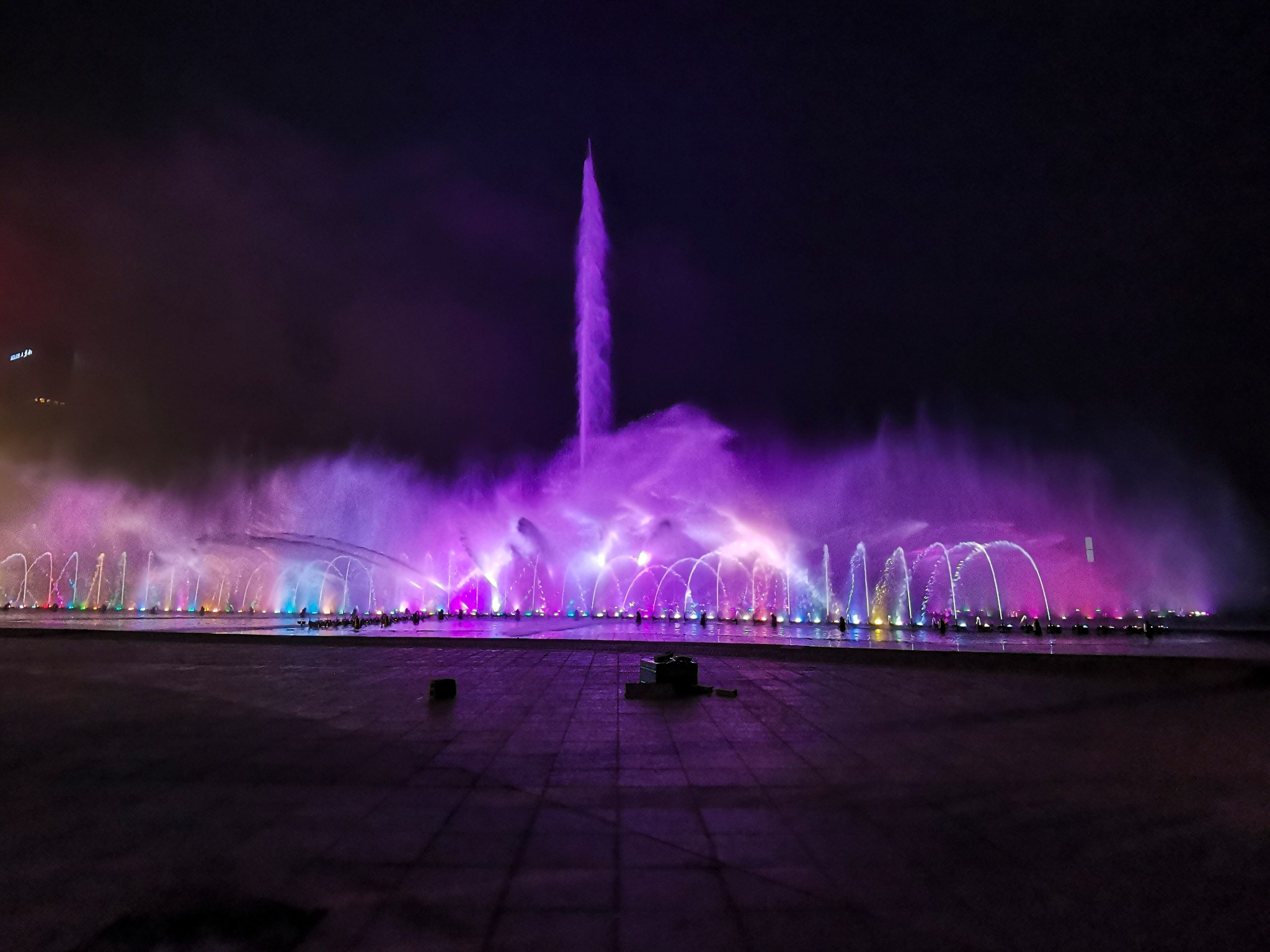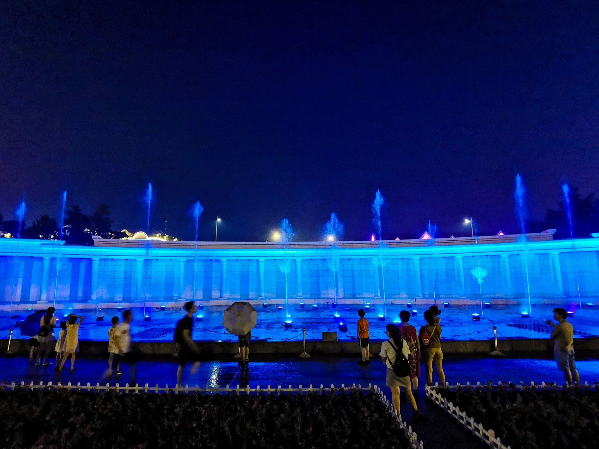到时7点40左右,广场上都是大妈在跳广场舞,喷泉池子边坐满了人,完全看不见有喷泉表演的迹象。等了会儿快8点了,池子边的人都起身了,随着大众来到了不远处的升旗台。8点喷泉准时开喷,此时才明白为什么有许多小孩穿着雨衣打着雨伞,小孩们玩的不亦乐乎。