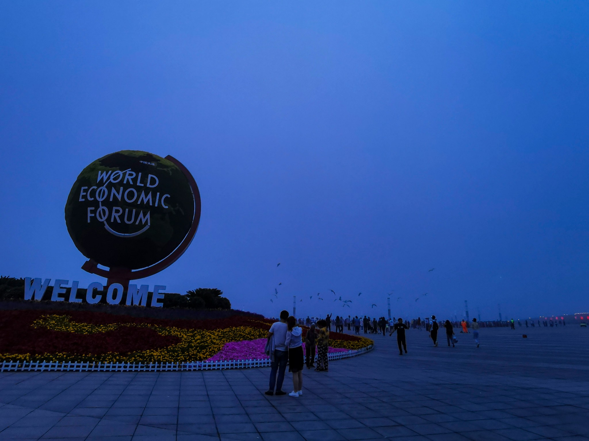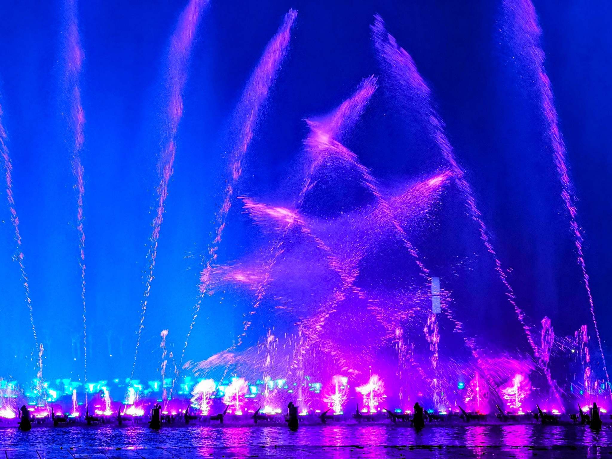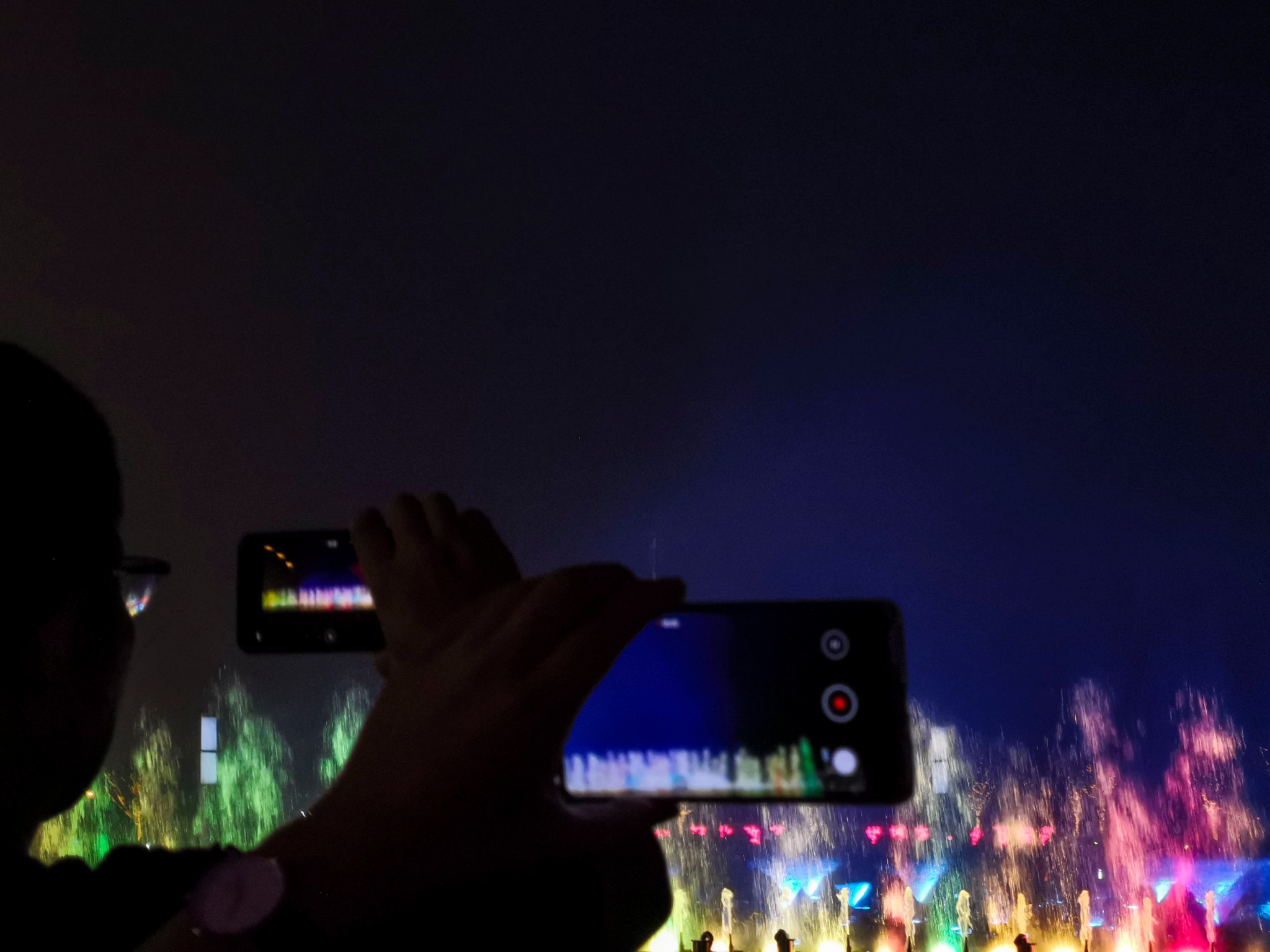 到时7点40左右,广场上都是大妈在跳广场舞,喷泉池子边坐满了人,完全看不见有喷泉表演的迹象。等了会儿快8点了,池子边的人都起身了,随着大众来到了不远处的升旗台。8点喷泉准时开喷,此时才明白为什么有许多小孩穿着雨衣打着雨伞,小孩们玩的不亦乐乎。