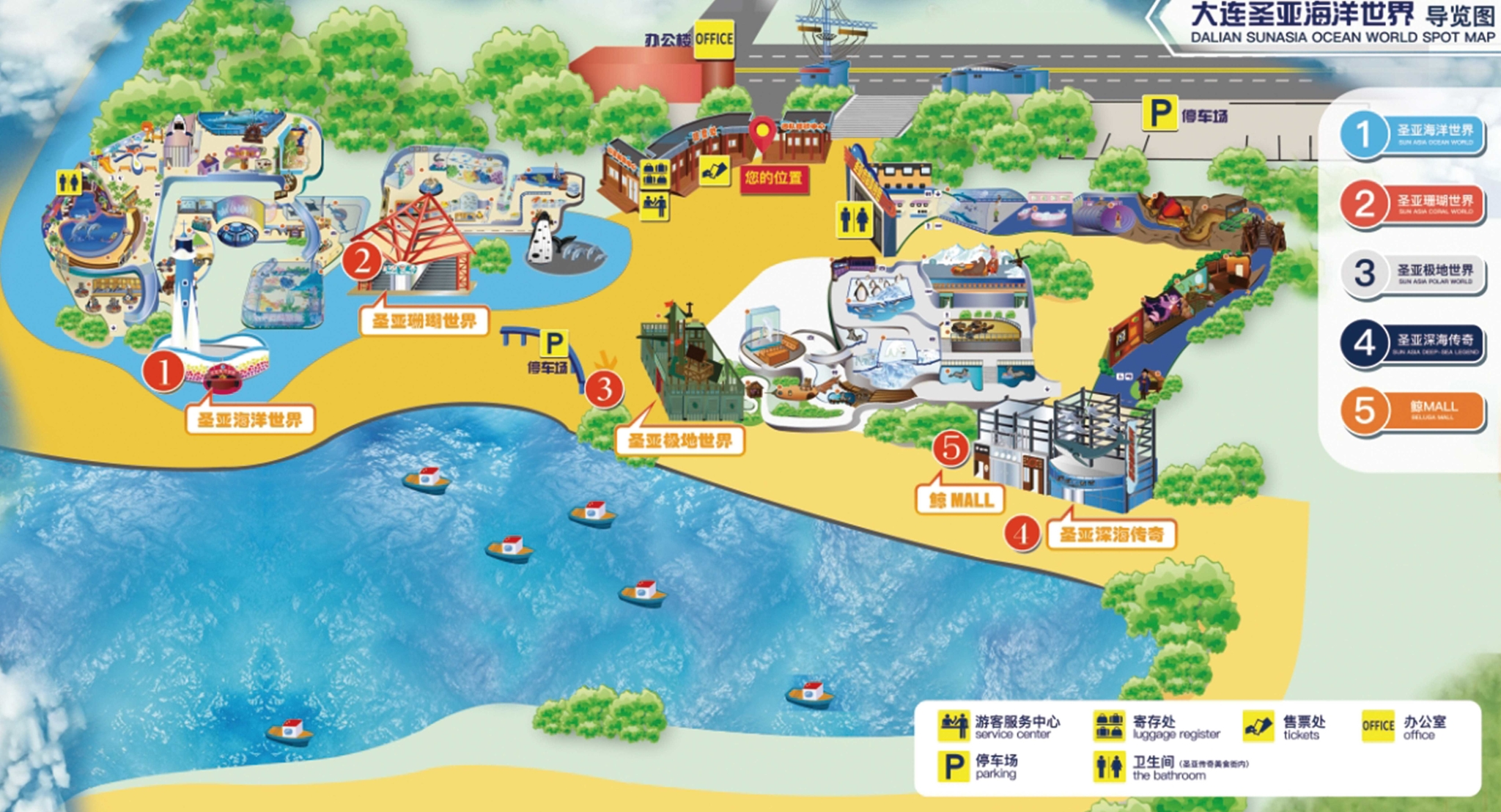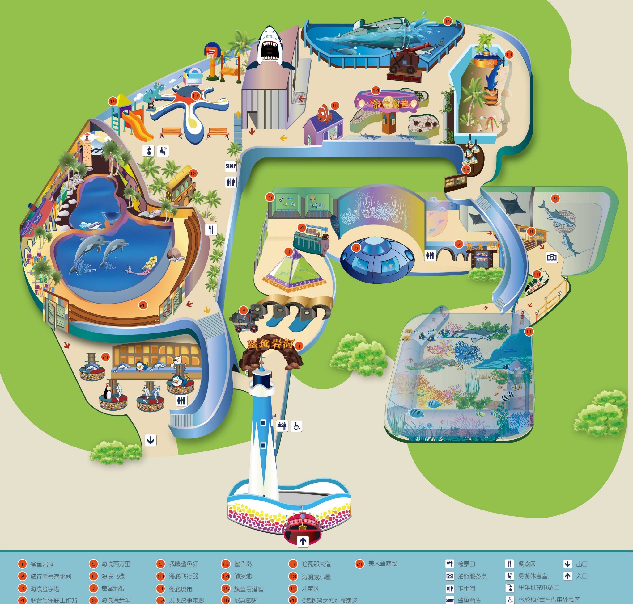 圣亚海洋世界有3个场馆:圣亚海洋世界(海洋馆)、圣亚极地世界(极地馆)、珊瑚馆。圣亚海洋世界的海洋馆和极地馆都有非常精彩的表演,可以循环观看,内部分别都有各类海洋动物展示。但珊瑚馆比较普通。2012年新开业了2个馆:恐龙传奇、深海传奇。目前圣亚主要销售的是4馆套票:海洋馆+极地馆+珊瑚馆+深海传奇(IMAX光影效果)。 大连 圣亚海洋世界的海底 通道 是 亚洲 最长的,118米长。最重要的是海底 通道 成了海洋主题乐园,情境式的,据说是世界第一座,让游客更能够融入到海底世界当中,感觉就像海底世界的一分子。圣亚海洋世界的动物表演,功夫海象、 海豚湾 之恋等特色表演,融入了剧情,也很棒。而圣亚位于星海公园,旁边就是海滨浴场,距离 大连 另一景点星海广场也仅有几步之遥。