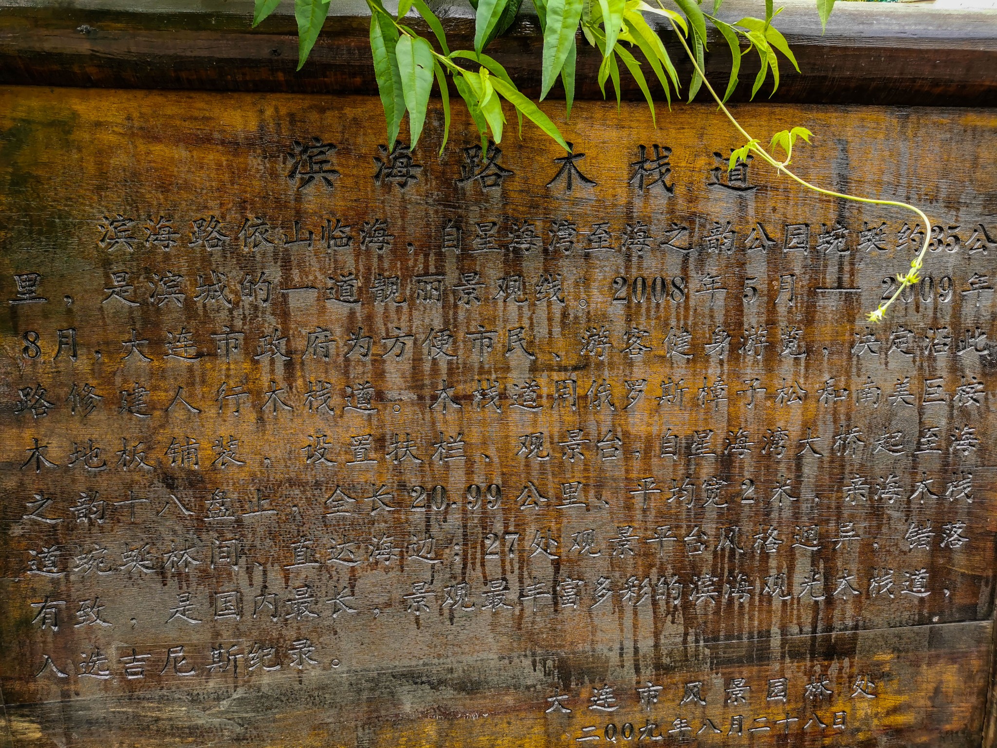 滨海路分为南段、西段、北段、东段4部分。其中2009年修建的海滨景观木栈道20.99公里,贯穿48个主要景点,每当春暖花开的季节,沿途奇景叠出,美不胜收。最吸引人的是滨海路上的人行木栈道,起点为星海湾大桥,终点为海之韵公园十八盘,全部采用南美巨桉木和 俄罗斯 樟子松防腐实木材料,贯穿八大景区48个景点,成为目前 中国 长度最长,连接景点最多,贯通全线的人行景观路。