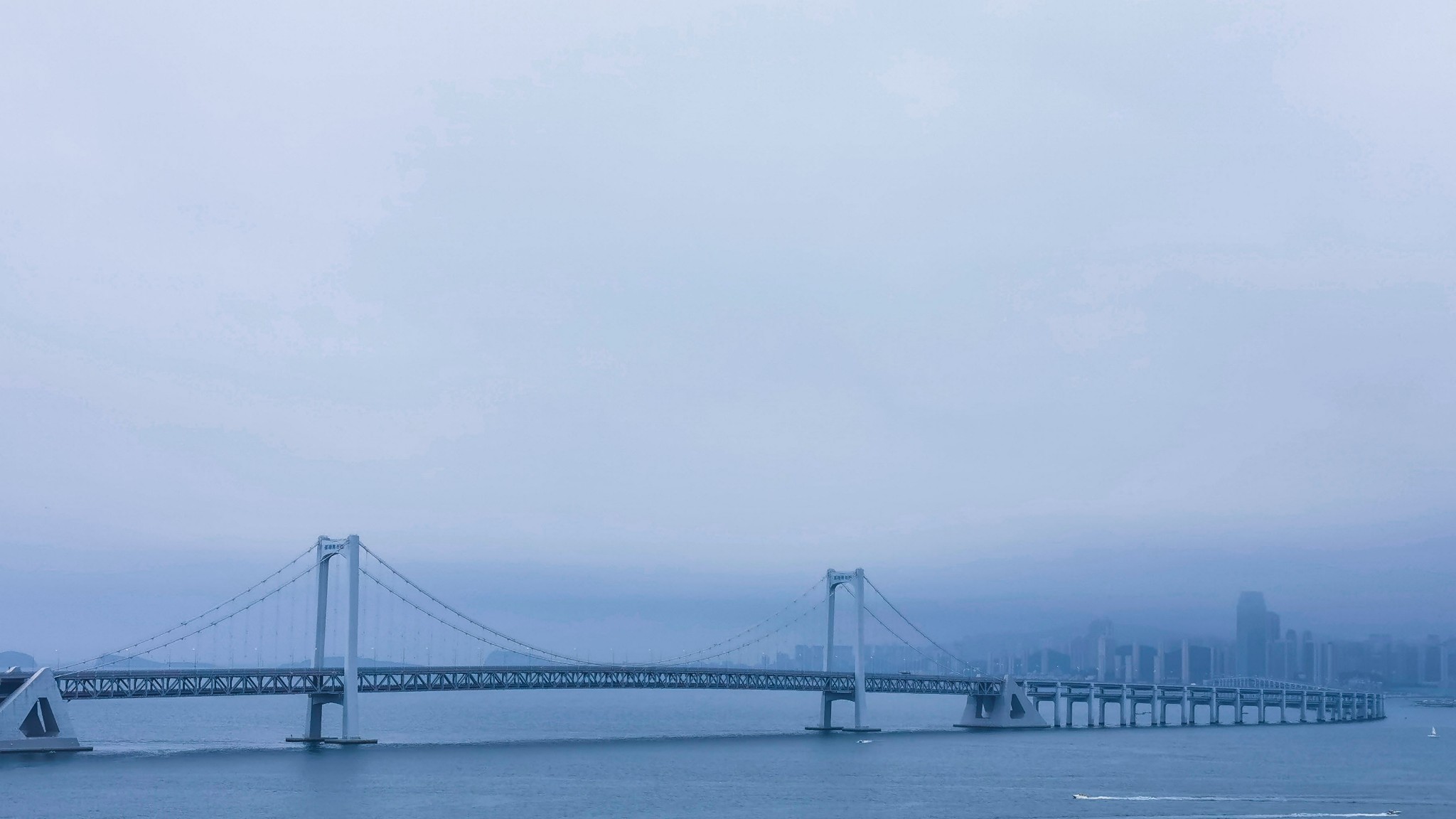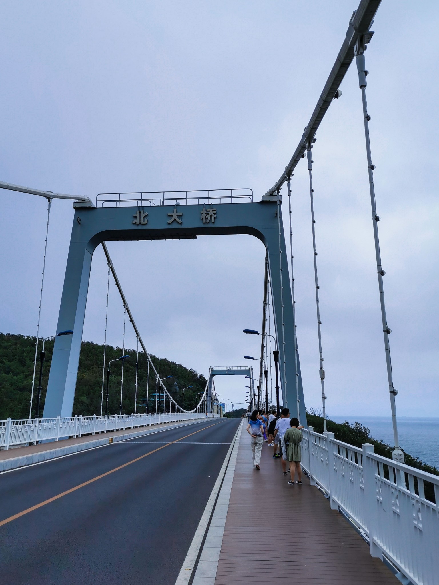 北大桥位于 大连 海滨风景区中的老虎滩景区与燕窝岭景区之间,是一座近诲临山横跨山谷的旱桥。它是贯穿整个 大连 海滨风景区东西滨海路的要冲,而且也是老虎滩景区西部和邻近的燕窝岭景区中一壮观秀丽的风景点。北大桥是 大连 市与 日本 国北九洲市结为友好城市之后,为增进两个城市友好往来,纪念两个城市人民的传统 友谊 ,分别在北九洲市公园中建立一个具有 中国 民族风格的亭——“大北亭”,在 大连 市建一公路桥——北大桥。1984年5月1日动工,1987年5月1日竣工。该桥为三跨简支加劲桁架悬索桥,全长230米,中跨跨径132米,桥宽12米,其中车行道宽为8米。主索失高13.2米,失跨比1:10。