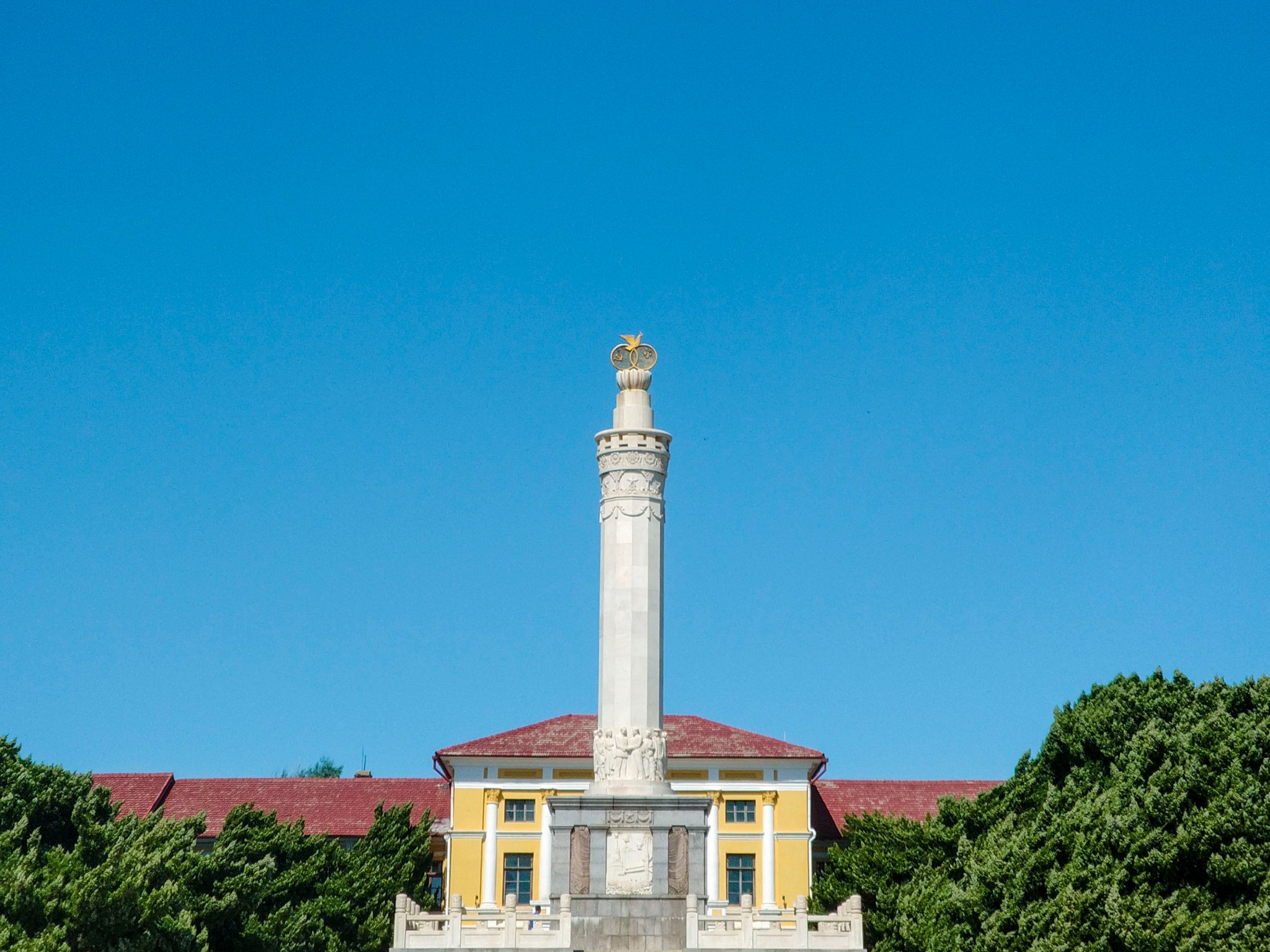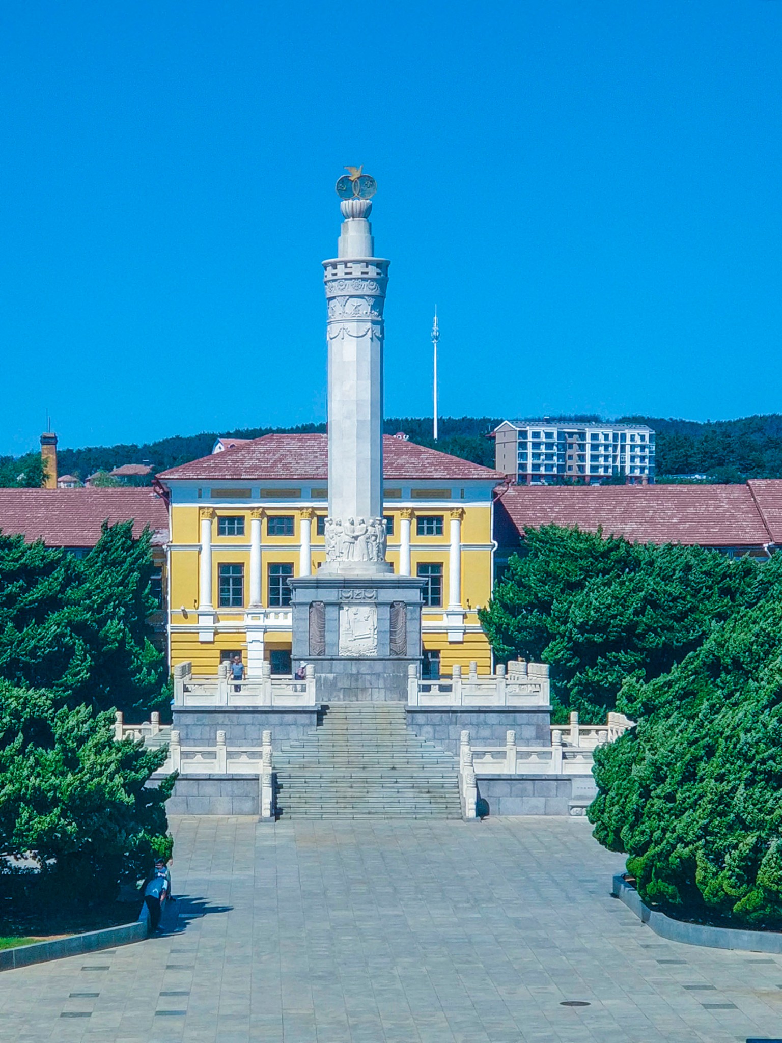位于 旅顺 博物馆门前,由七十八株常青古龙柏树环抱,矗立于绿丛中。塔呈圆柱形,由名贵雪花理石雕砌,高22.2米,造形精致。1955年2月23日奠基,基石由周恩来总理题词:“中苏 友谊 塔奠基”。参加奠基仪式的有:中华人民 共和 国副主席宋庆龄、元帅彭德怀、贺龙、聂荣臻和郭沫若,以及苏联驻华大使 尤金 等。郭沫若在奠基仪式上讲了话。中苏 友谊 塔,塔基用花岗岩砌成,呈正方形,长宽各22米。为双重月台,周围是石雕栏杆,四面阶梯。栏杆的 石柱 头上雕刻着盛开的牡丹,翱翔的鸽子和朵朵白云,具有我国民族艺术风格。塔身底层有四块浮雕,分别雕刻着 中国 北京 的天安门,苏联的克里姆林宫,鞍钢高炉, 友谊 农场和 旅顺 港的秀丽风光。雕有十二个姿态各异的中苏两国人民的群像。塔的尖端用雪花石雕刻一朵盛开的莲花,托着中苏 友谊 徽和一只展翅欲飞的鸽子。象征着中苏 友谊 和两国人民的伟大团结。