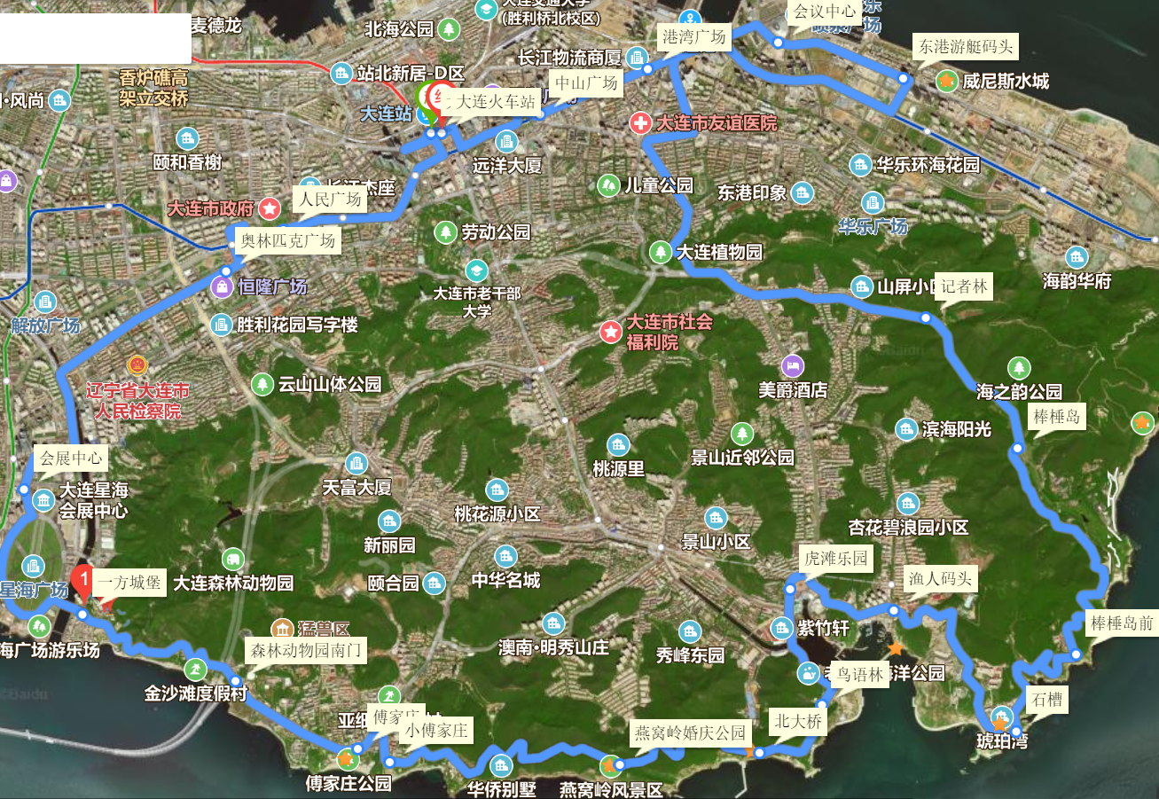 行车路线: 大连 火车站→人民广场→奥林匹克广场→会展中心→一 方城 堡→森林动物园南门→傅家庄→小傅家庄→燕窝岭婚庆公园→北大桥→鸟语林→虎滩乐园→渔人码头→石槽→棒棰岛前→棒棰岛→记者林→会议中心→ 东港 游艇码头→港湾广场→ 中山 广场→ 大连 火车站
