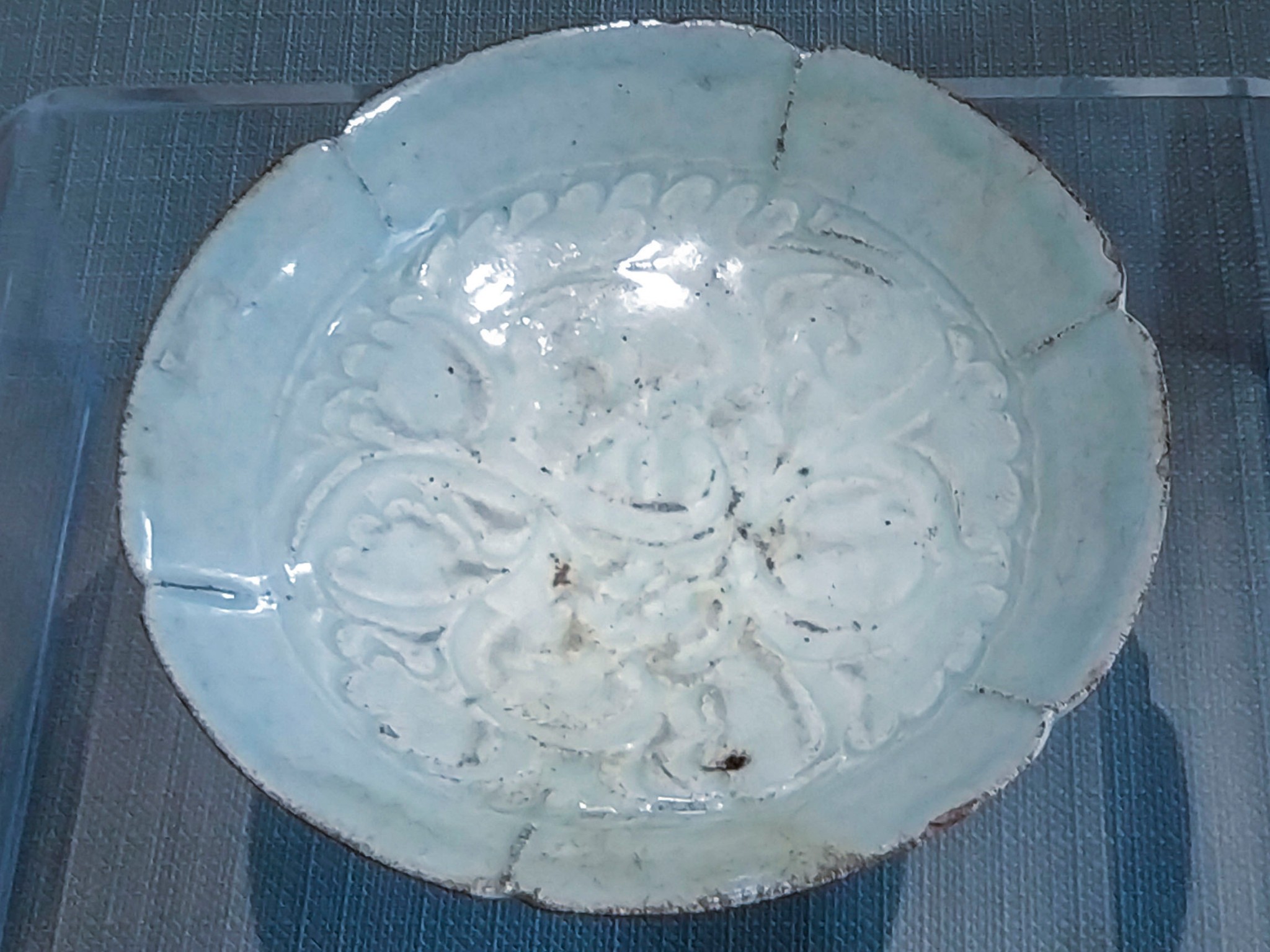 十二花瓣形,菱花口,宽边折沿,盘壁弧圆,内底平整,圈足,外底不挂釉,釉质温润光洁。青花发色浓艳深沉,凝聚处可见黑褐色结晶斑,深凹于胎骨。盘边绘缠枝花边饰,内外盘壁绘单株十二月花卉,内底绘缠枝莲纹。图案以三组依盘形勾画的双线纹分隔。