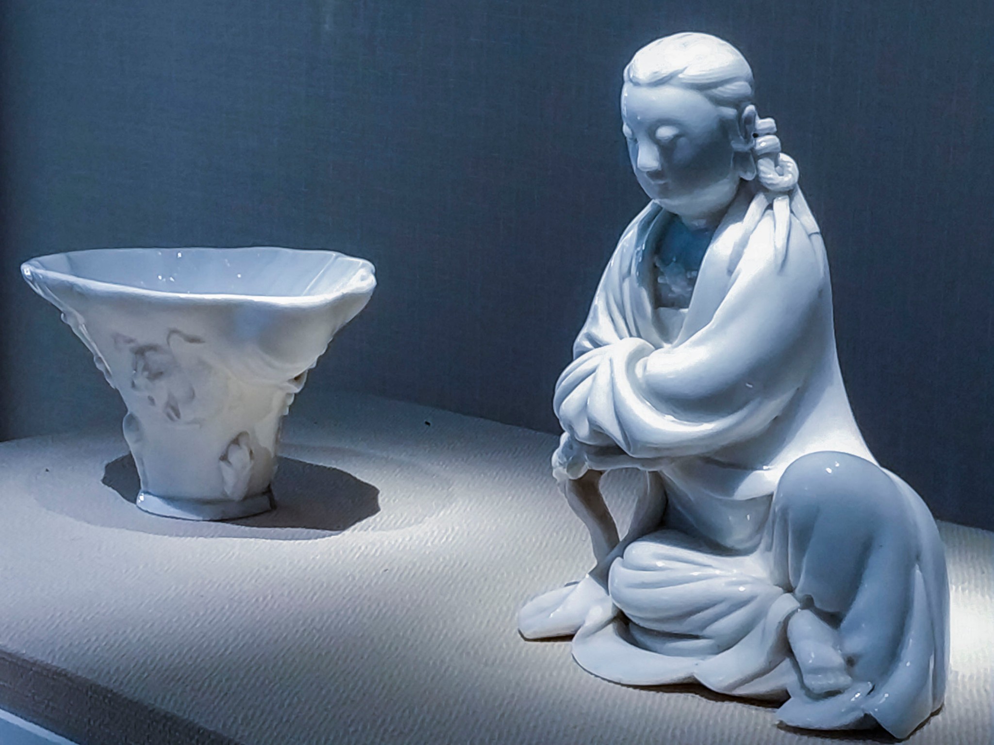 观音倚几坐姿,发丝分缕后梳,扎成两束发辫,发辫编盘于耳后,辫梢披肩。面庞丰腴,目光俯视,表情恬静祥和。上身披天衣,内着长裙,衣纹深而洗练,胸前佩戴缨络。左膝支起,右腿盘座,双手合于袖内,右肘拄几。几一腿,为兽首兽足形,呈弓曲状,白釉润白如凝脂,胎质细腻坚硬,透光度极好。