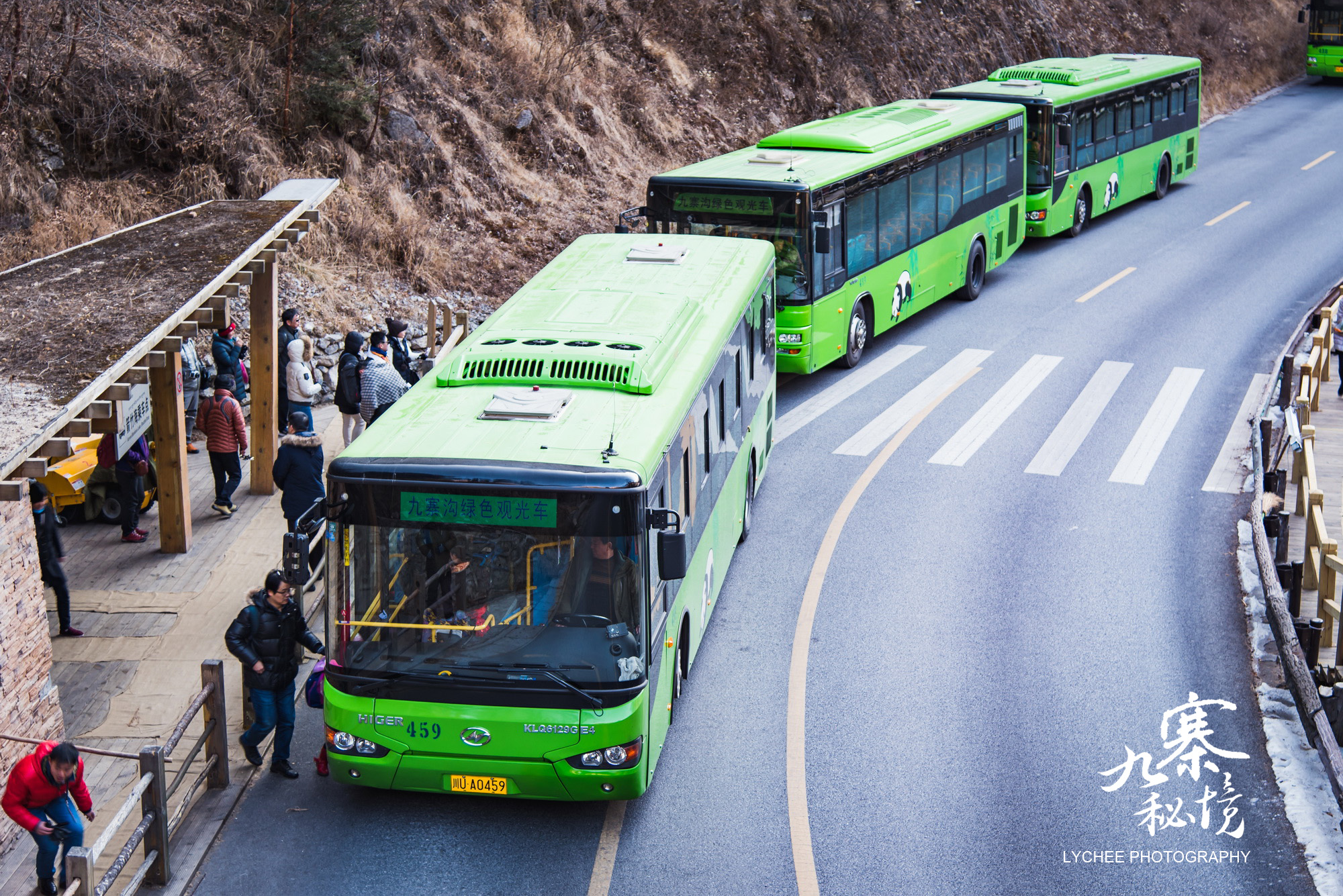 出沟的时间一般最晚是下午4:30左右,因为4点开始就会有工作人员催大家走了,每辆观光车都会自称是末班车,沿途的站点也大都不停,直接把人都送到沟口去。不过冬天白天短,虽然一般是5-6点开始变暗,但过了4点光线就没有层次了,已经不适合拍照。