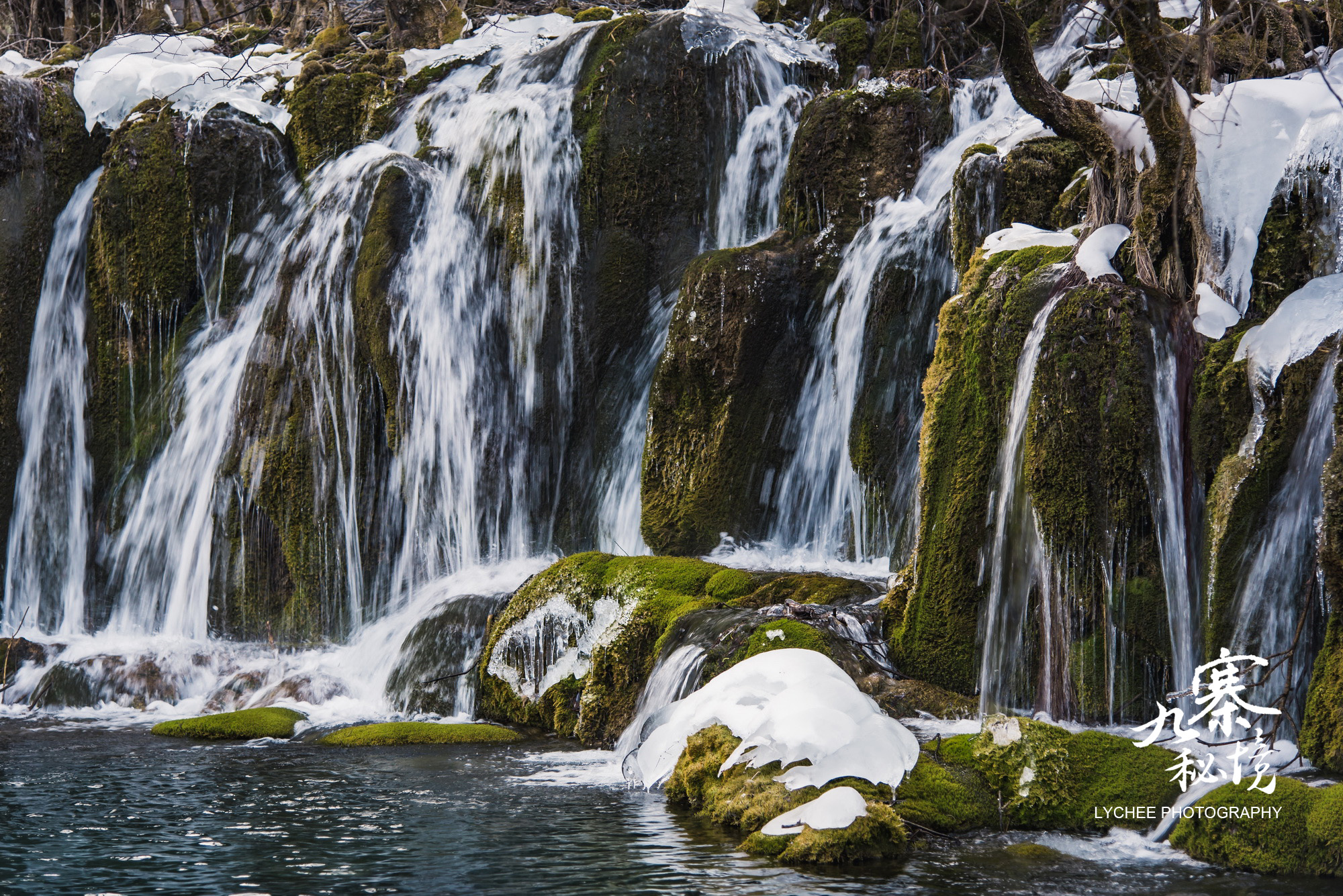 沿栈道往下是箭竹海瀑布,海拔2629米,宽150米,高25米。水从树缝间、青石上涌出来,有些是无数细小的溪流,有些汇聚成一股奔流的瀑布。有些地方还结了冰,晶莹剔透。