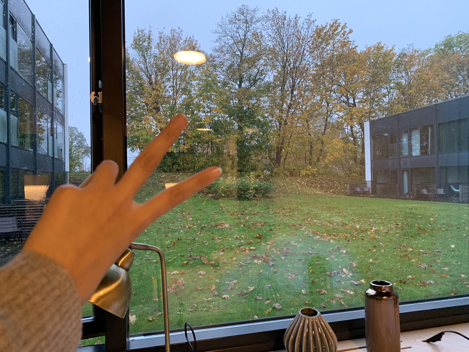 清晨醒来洗漱早饭,等待粗发的时候,突然看到一抹惊喜。房间的大窗户外面就是一片草地树林,下着小雨,感觉甚好。
