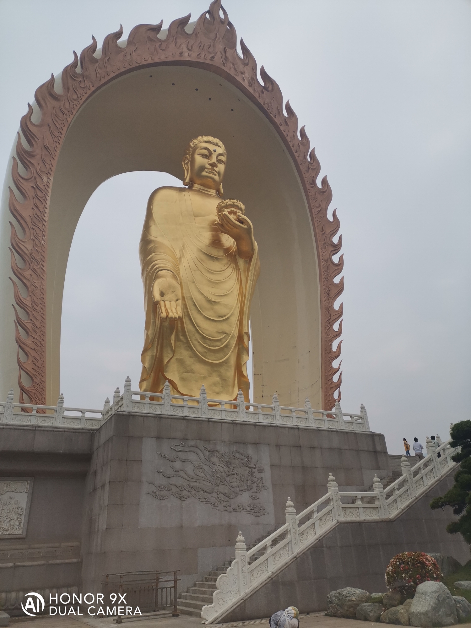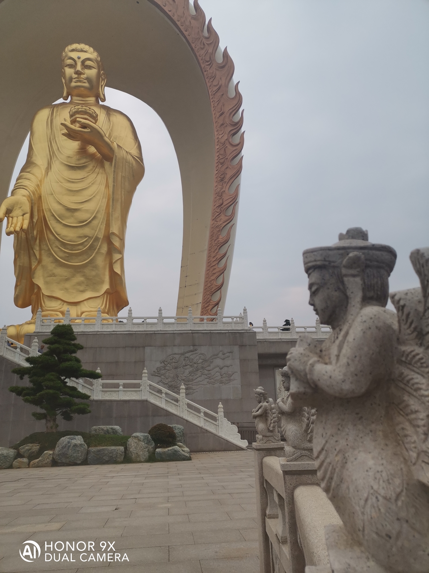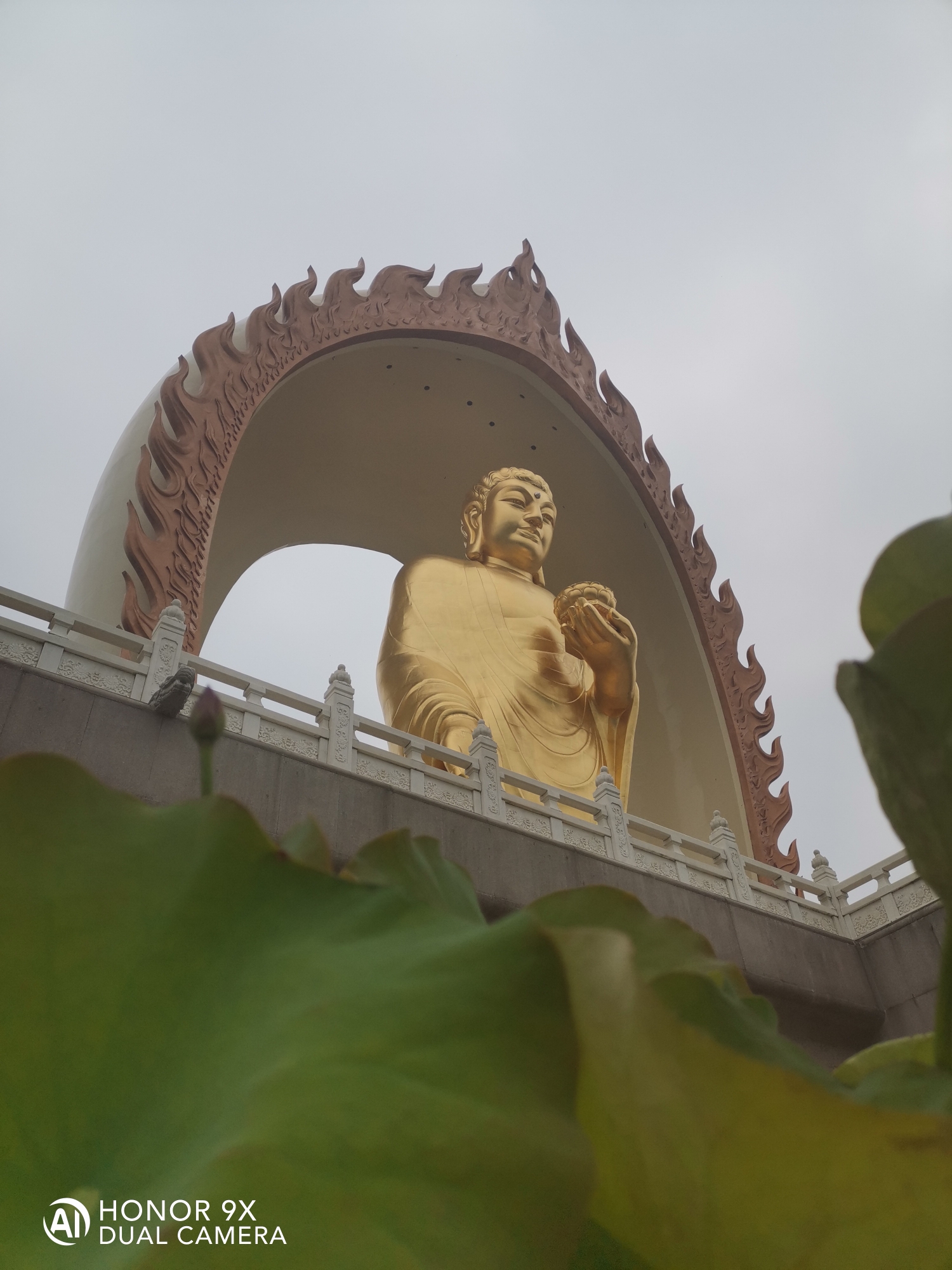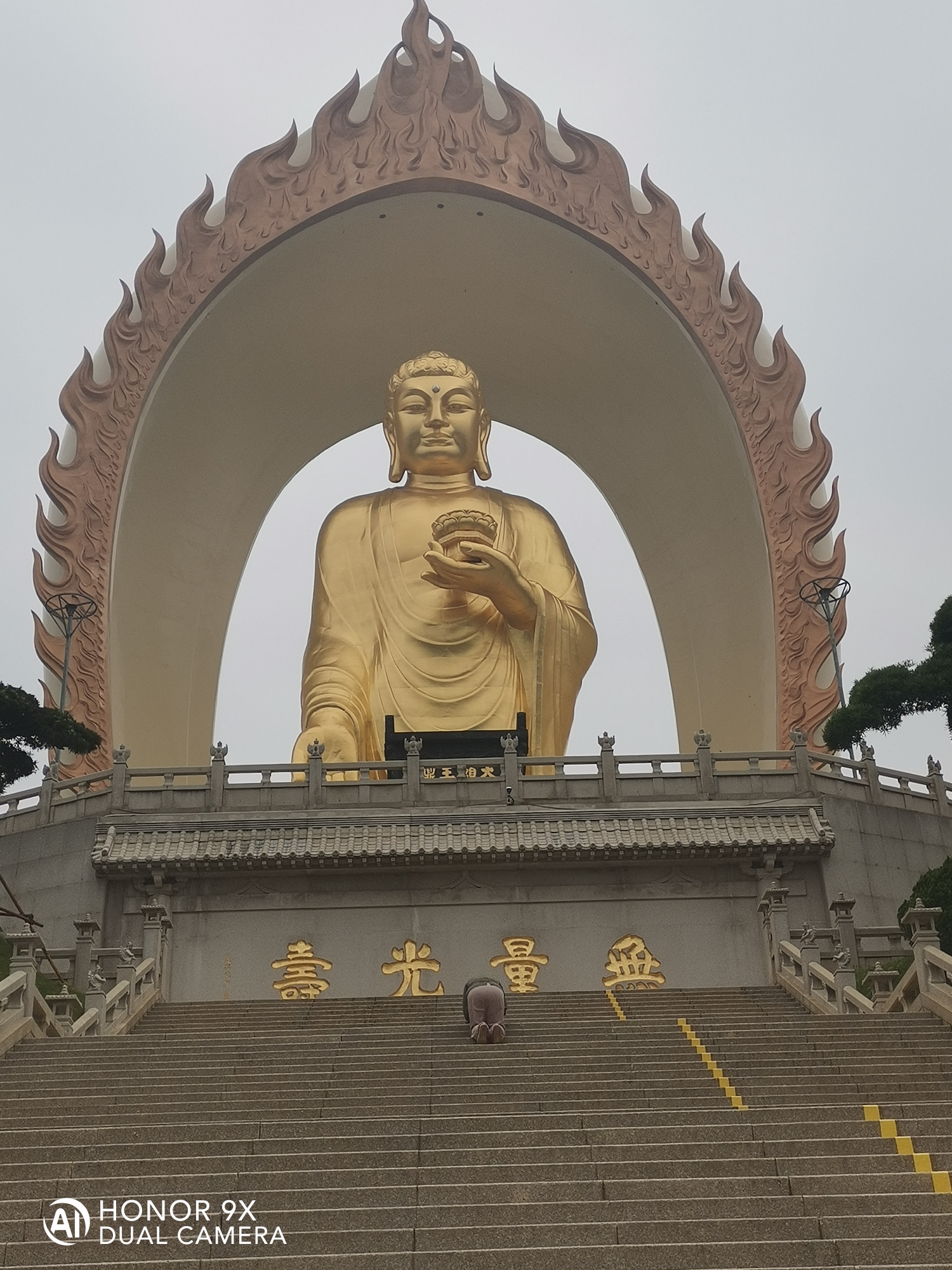 阿弥陀佛圣像,身高48米,宝盖81米,锡青铜铸造。莲花座6米,因铜里面融入了48公斤的黄金,又可称为合金铜铸造。大佛与莲台表面采用传统大漆工艺贴金,外表呈金色。佛身高48米表48大愿。
