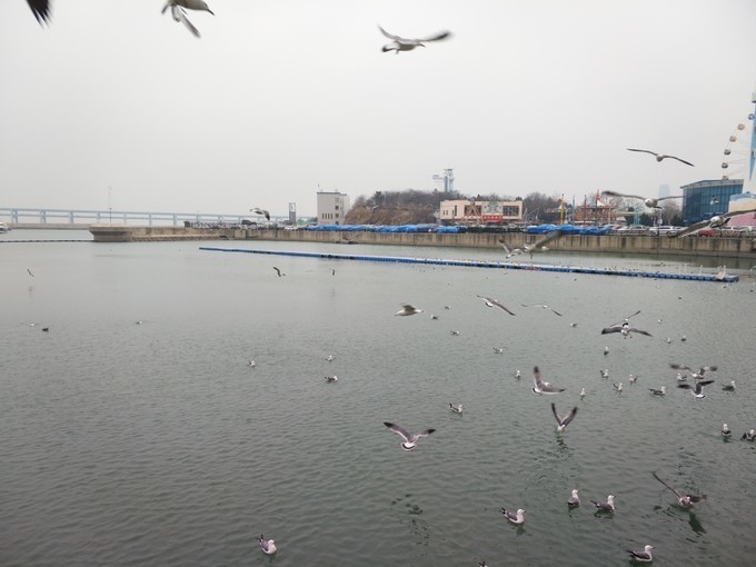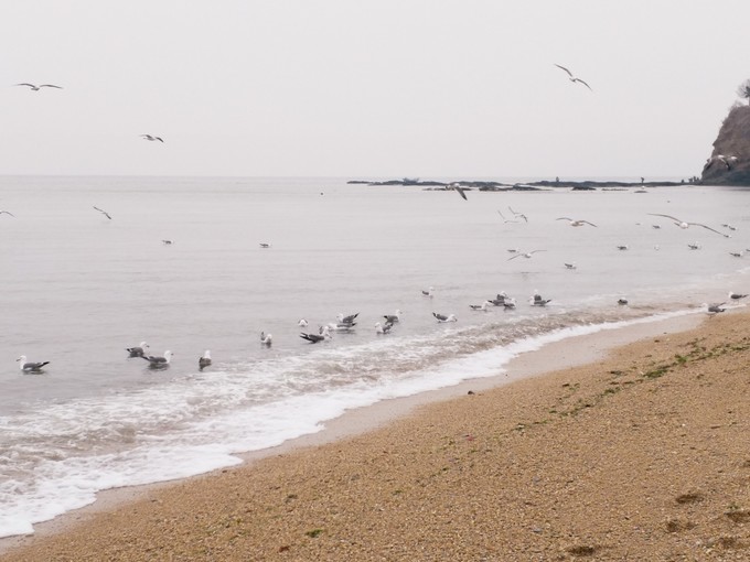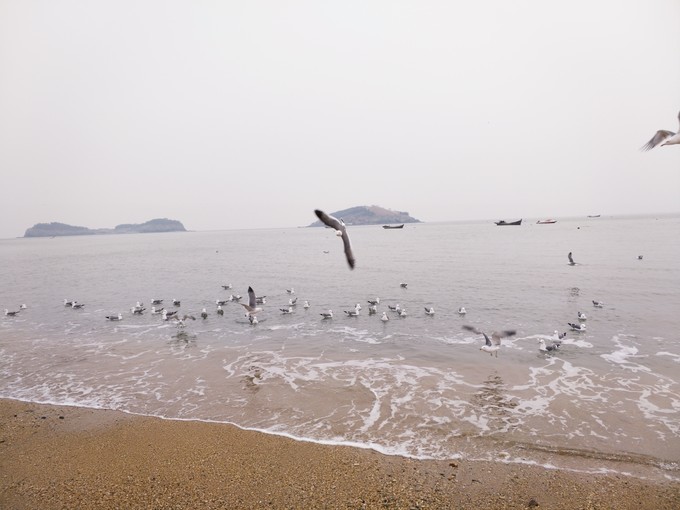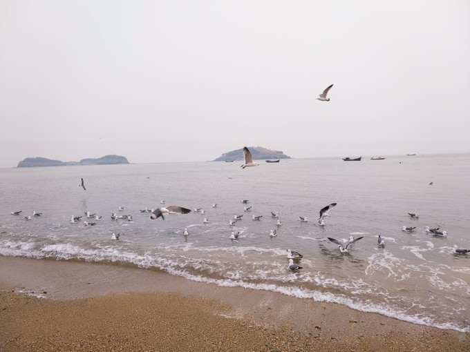 出了极地馆,有一段路在海边,成群结队的海鸥飞来飞去,路边也有叫卖海鸥食的。
