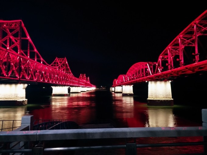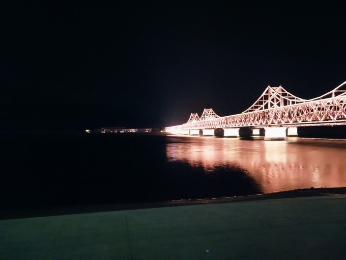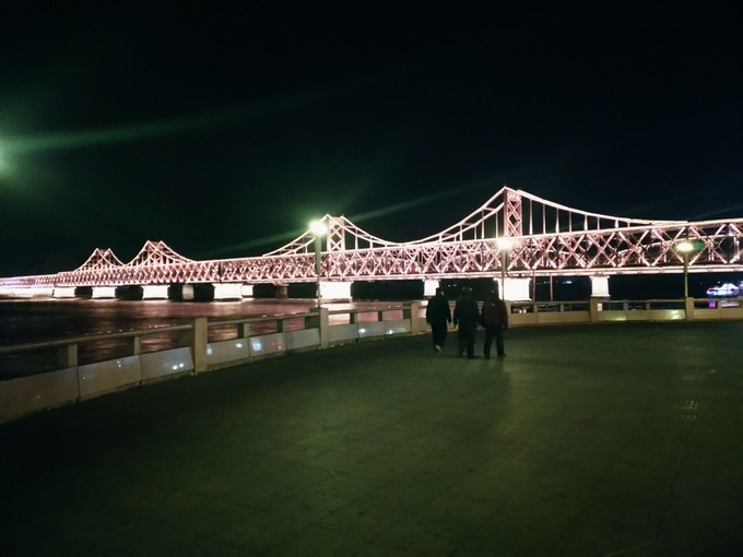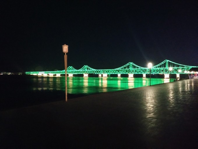 丹东 这边灯火辉煌,而对岸 新义州 的灯光稍微弱一些,并不像有的游记说的那样一片漆黑,伸手不见五指。从对岸看,亮灯的地方应该是路灯,还有楼房里发出的灯光。