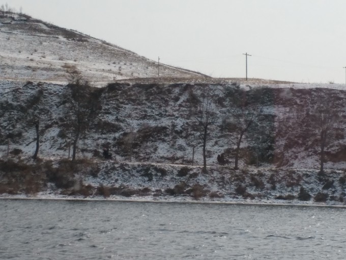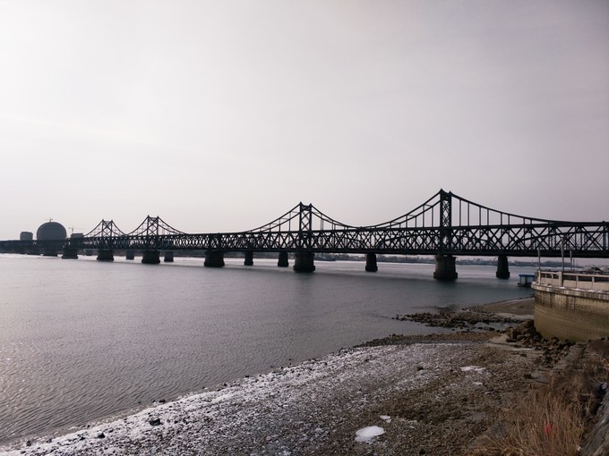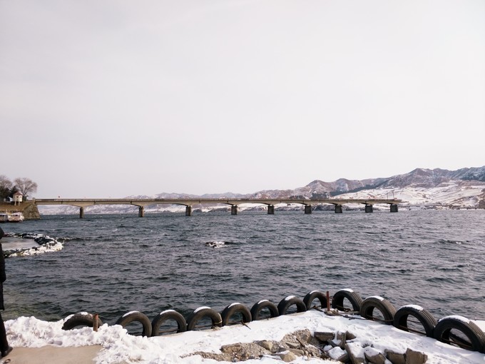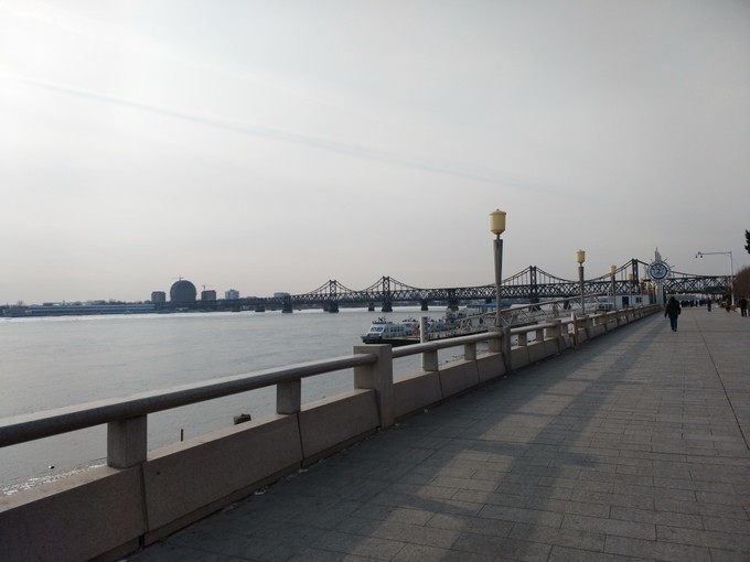 白天的 鸭绿江 畔,还是超级的冷!!!江对岸有一个圆形的建筑,从 丹东 这边看,貌似还没有建造完,还有一个摩天轮,应该是废弃的,本想报一个 新义州 1日游,但网上的团最早是7号,看来去 朝鲜的计划有破灭了。