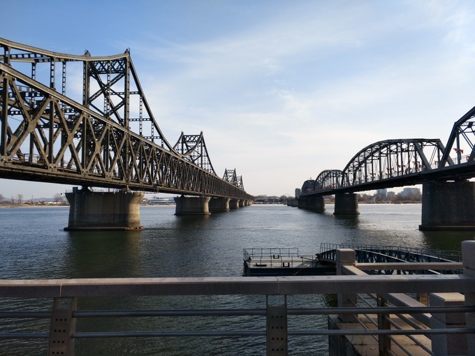 我们刚刚看到的 鸭绿江 断桥是铁路桥,这个桥是公路桥,当年也被 美国 大兵给炸断了,据说毛岸英当年走的就是这座桥。