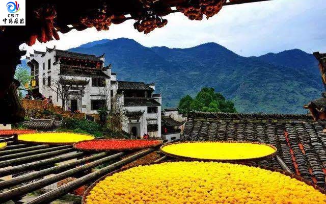 乘观光索道上山盘山而入,豁然开朗,一条天街贯穿东西,两旁白墙黑瓦,古建魏然。因大清朝曾出过父子相国而文风斐然。村子依山而建,这座挂在山崖上600多年的古村落 ,地无三尺平,屋)顶架晒成了凉晒农作物的主要场地。数百栋徽派古民居在百米落差的坡面错落有序排布,整个山间村绘就出世界独一无二的“晒秋”农俗景观、最美的乡村符号。