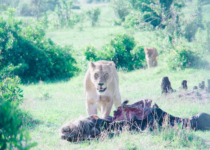 母狮直勾勾的眼神,还是有点吓到我了,好像不太开心一顿美餐被打扰了。不过,当母性光辉闪耀,她的眼里总是充满温柔。她与她的孩子分享这战利品,把最鲜美的一部分分享给孩子们。