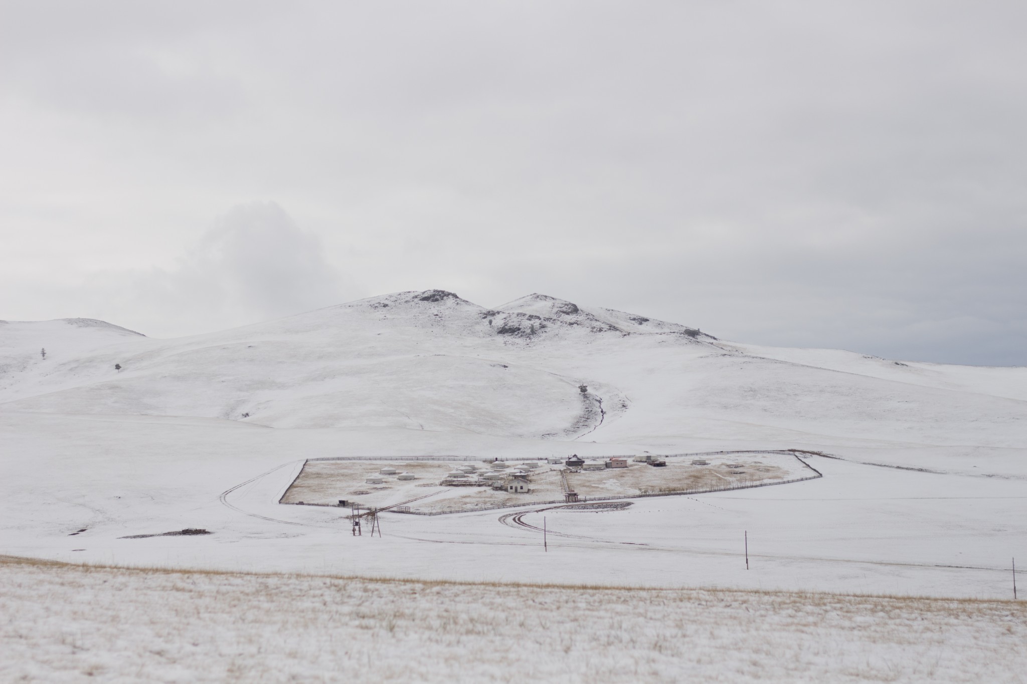 到了山顶,向下俯瞰, 哈拉和林 小镇尽收眼底,雪后的纯白更给这里增添了一份童话味道。伫立在山头环顾,时不时经过的小牛和来自山间空旷的风交相吟唱。