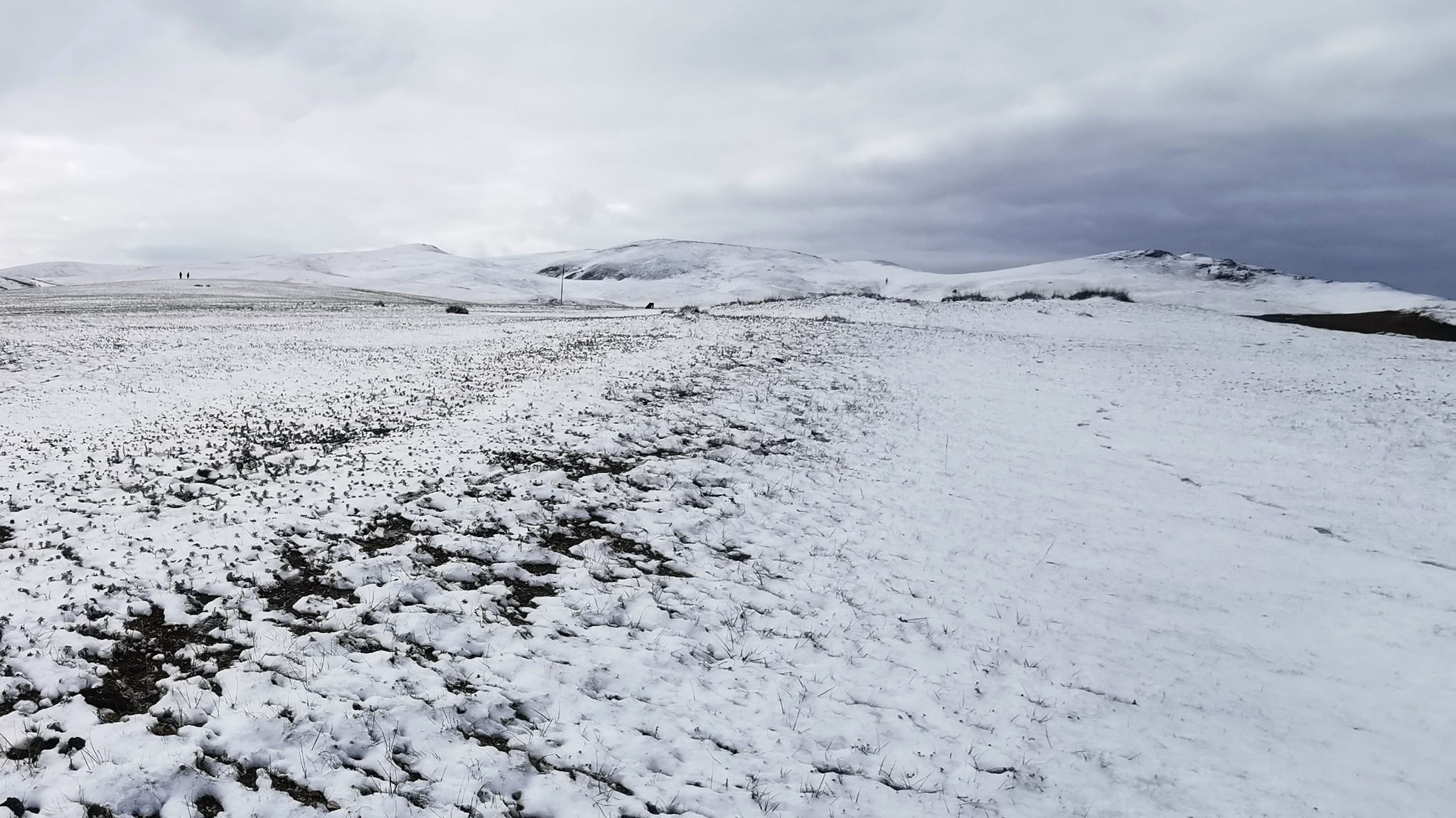 经过前两天的大雪,今天的天空终于放晴,再一次爬到对面的山头,已经不再是荒芜,积雪在阳光的照耀下,泛着纯白的光亮,像月光照在湖面的皎洁。远处的山头,牛羊多了起来,我们追随着牛羊的方向,向上攀爬。